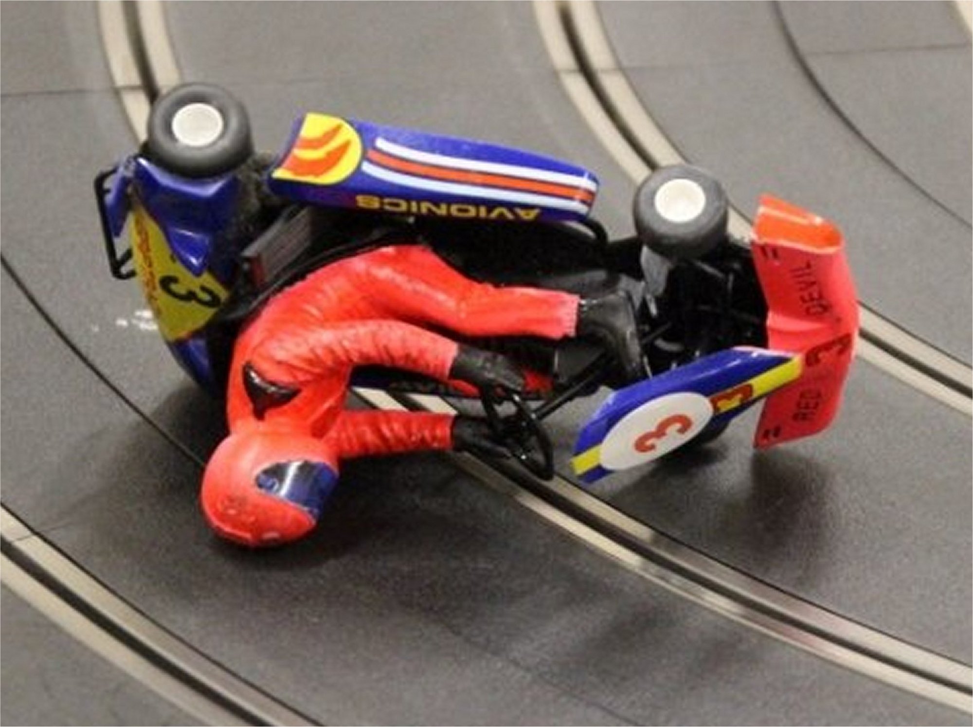At one point David and Vic' were side by side at the corner after the drivers station when David's car went up on 2 wheels for a few inches before dropping back into the slot to carry on racing. Great fun but no photo.