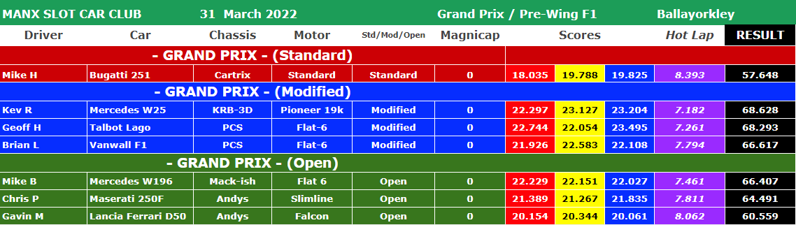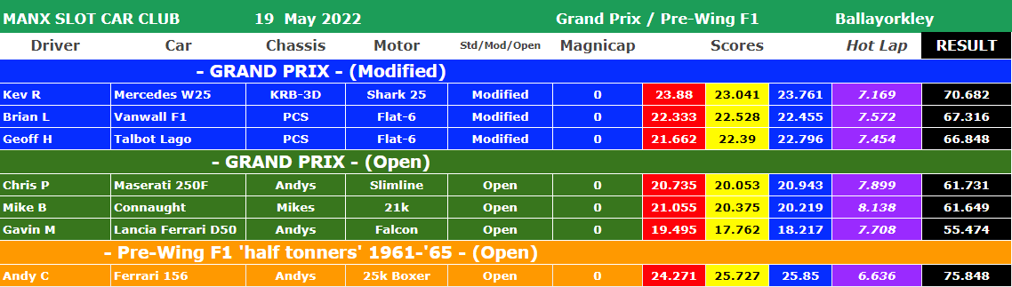 Tonight there were seven different GP cars, Mike H was the sole entry in the Standard class, the Cartrix Bugatti 251 went best in the middle lane and the closest race was heat #3 finishing 3 tenths of a lap behind Gavs rapid Lancia.