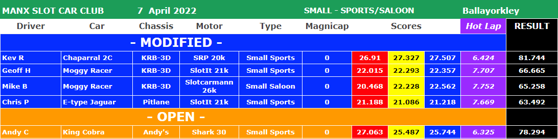 Modified Class was a SlotIt Group C with NSR Shark motor battle, Geoff’s Toyota stopped on track with a broken guide wire, the race was paused whilst the pit crew got it repaired…only for the other wire to break in his final race which required a car swap.  Unsurprisingly his best run was in Yellow.  Kev’s Jaguar went much better in Yellow & Blue than the Red lane which caught the car out with one deslot and couldn’t find race pace in qually (in the Red lane) which would have seen a better finish in the handicap results.