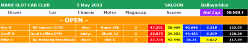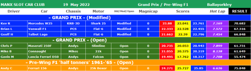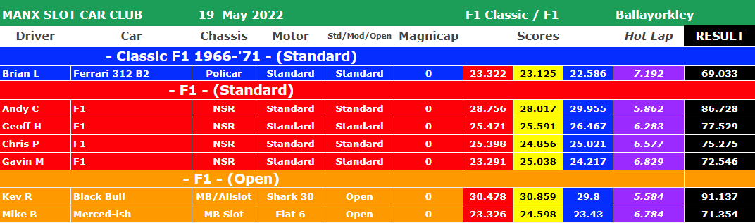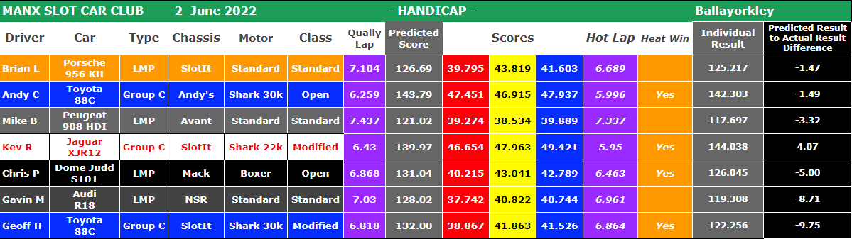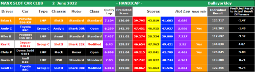 I’ve done two results charts, a normal results sheet with Standard, Modified and Open class results and the second results sheet where the cars are listed on how close they were to their ‘predicted result’ using their best qually run lap time.