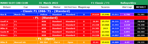 One Standard Classic F1 tonight, Kev’s Policar March 701 managed two heat wins the closest was heat #1 ahead of Mike H’s NSR F1.