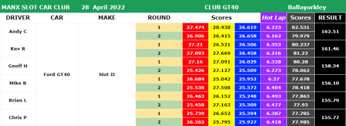 Geoff & Mike raced 3D Moggy Racers, both cars with S-can motors.  Mike lost out in the Red lane, other than that there was very little between them either lane scores or hot lap times.