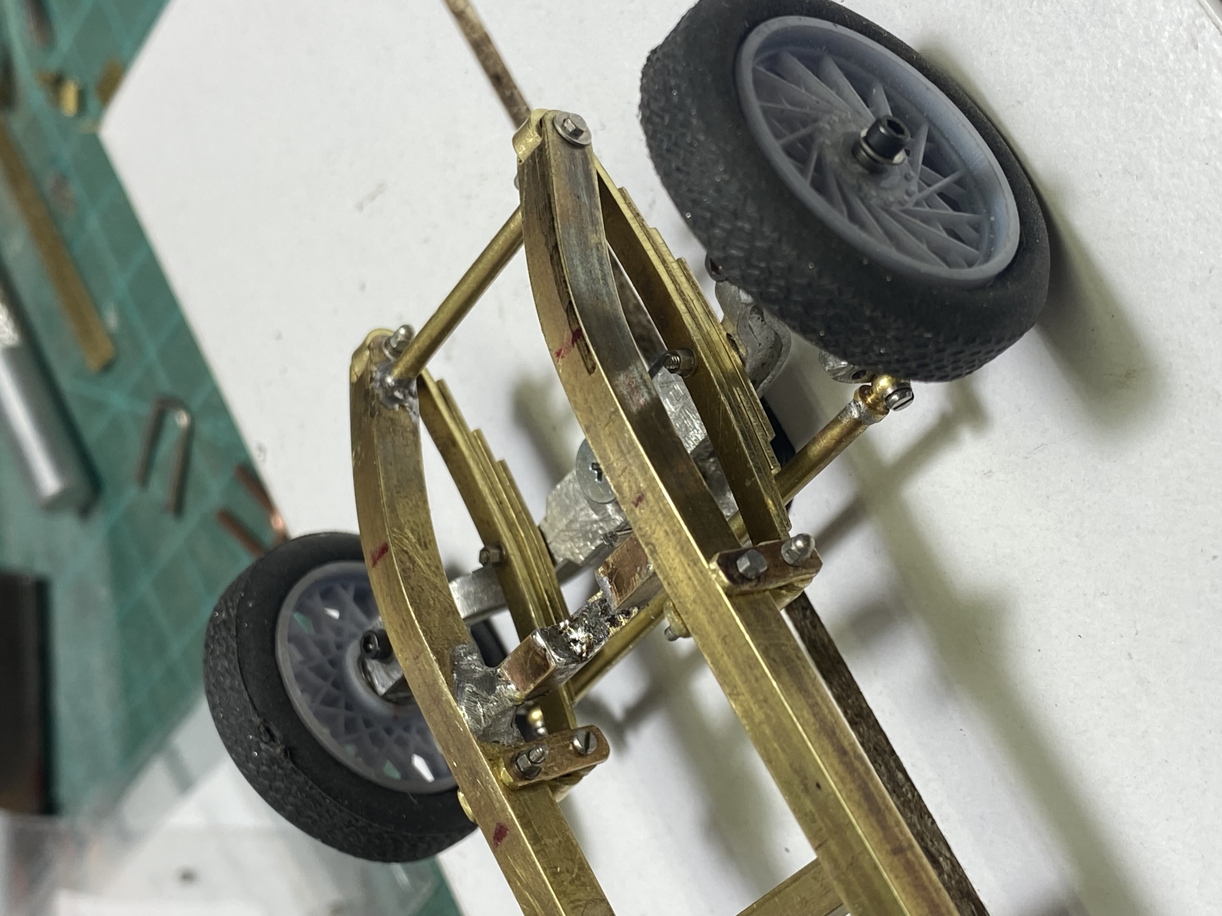 Made the steering bar from brass tube and brass eyelets, the metal parts that hold the wheels are from an old slotcar steering set up.