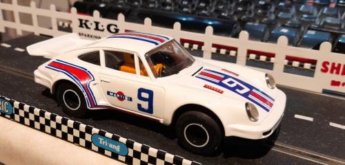 A Scalextric Porsche 911 - Door tampos a bit worn and hardened tyres, but that is normal for these.  Its the Johnson Motor Era version and that tends to be what we race at my friends track. Both headlights are present and that can be unusual for bargain priced cars.