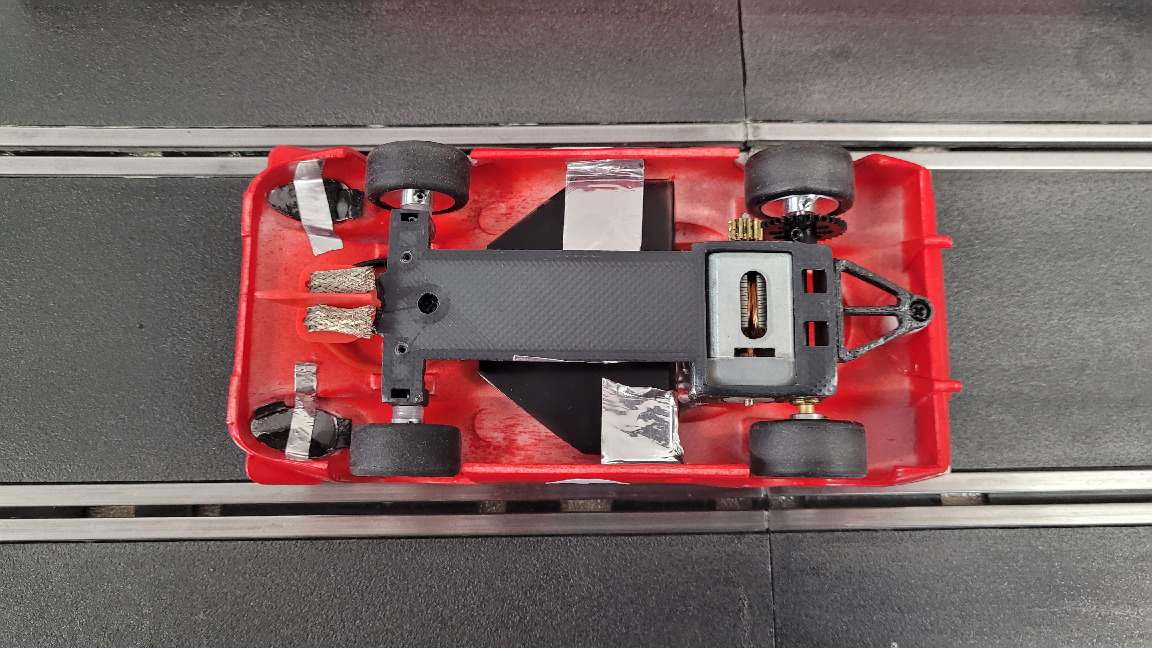 PCS 17'' wheels and tyres , my own 3DP inserts , Scaleauto guide and gears , and a 'Shark' motor ( sticker fell off )