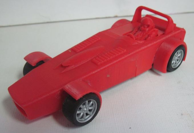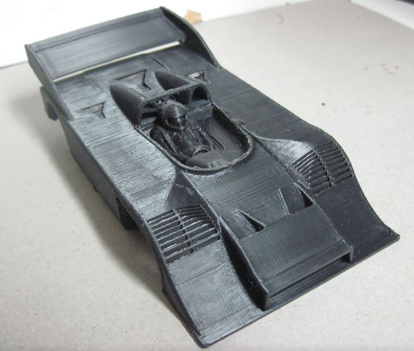 Above is the 2nd trial print after some trimming and assembly (rear wing & driver). Gradually adding more detail to the design and refining the print to alleviate process issues i.e. 1st print the wing assembly snapped as too thin. Some profile compromises made due to print and software limitations but the overall dimensions are correct for wheelbase etc.