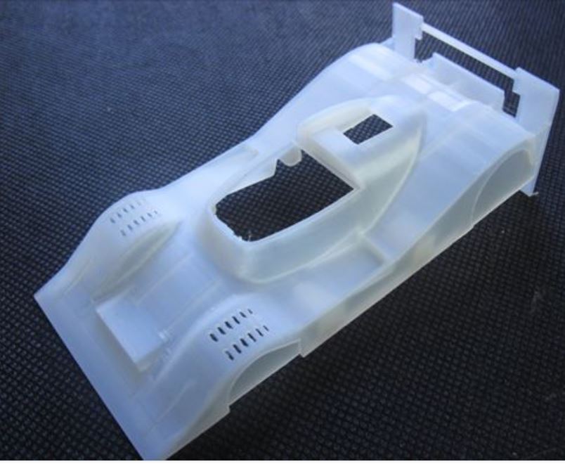 Below is the body shell straight from the printer printed in translucent PLA which has no pigment and hence I believe will be better for painting. Future orders will use this material for the shells, chassis' will continue in black PLA. Note the body shell will require trimming to remove all the printer supports as shown around the rear and arches.