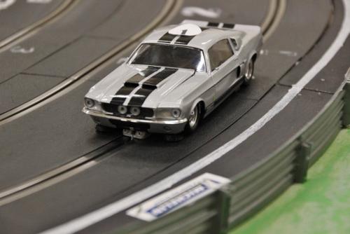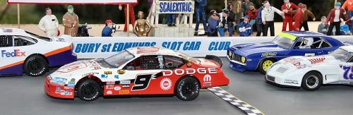 Back to more familiar (analogue) ground for this meeting luckily, as a couple of potential new members turned up to race the club (Shaun) provided Minis and owner/driver Nascar and American Muscle cars. Stewart and Larry made it up to fifteen attendees for the night. With the long track set up, voltage on 11.5 and practise over, the racing began.