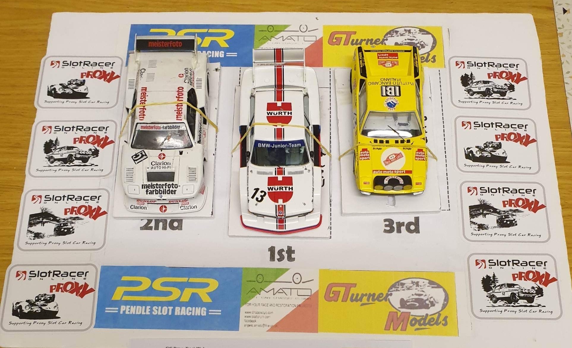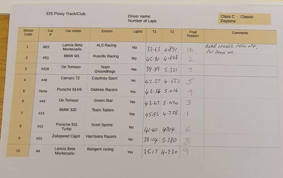 Team Tatters BMW 320i returned to form taking 1st place, Courtney Sport's Camaro did a respectable 2nd place (even after its Guide shoe had been replaced with a slimmer and shorter NSR replacement). And the very reliable Ruscillo Racing BMW M1 landing a valuable 3rd place. The Lancia BMC of Bangers Racing only managing a 4th Place on this smaller circuit.