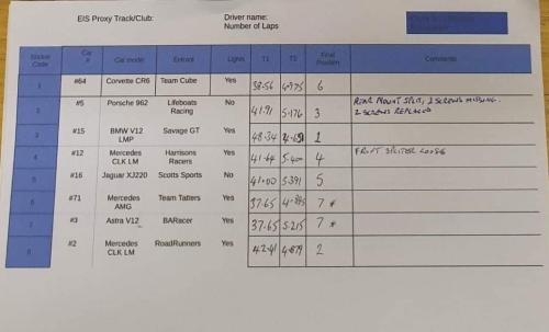 The BMW V12 of Savage GT seems to be comfortably in front of the field, with Road Runners Merc and Team Tatters AMG Merc running 2nd and 3rd. However the Corvette CR6 of Team Cube has put in a couple of great runs in the last 2 Rounds, so perhaps this could ba a challenge for a podium position.