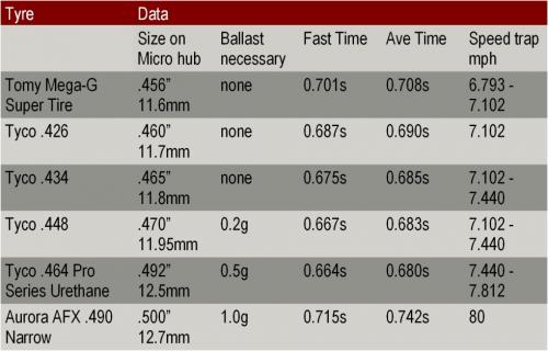What I saw was a clear progression of lower ETs and higher speed trap readings, until we got to the two highest sizes. Although the 464 urethanes gave the quickest ET and average ET of the test, at least 0.5g of weight was necessary to prevent the front lifting, which caused poor starts and occasional deslots. The car was more consistent with the weight - and a wheelie bar would certainly have helped too. I don't know if the softer urethane compound helped or hindered that initial grip... The silicone version would have been good to compare. The Aurora .490" tyres caused problems at the start, although the car was rapid by the end of the strip. It's probably a combination of a little too tall for the motor/gearing - although that will be part of the fun building and tuning a Super Stock car.