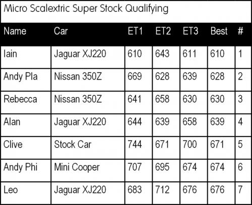 Iain was Top Qualifier in Micro Scalextric Super Stock with his re-built Jaguar. The air scoop made all the difference! There will be no room for errors tomorrow - all seven cars are on the pace.