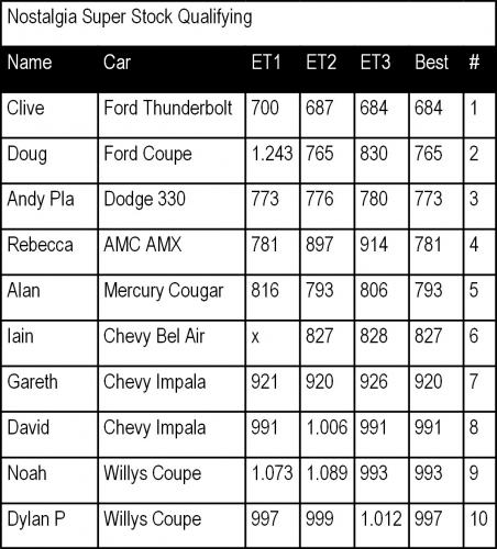 No surprises at the top of Nostalgia Super Stock - Clive's Thunderbolt is a class act. However, Doug's Ford Coupe hooked up a cracking run to go second. I would say the Coupe is the car Clive needs to fear - if it gets through to the final.