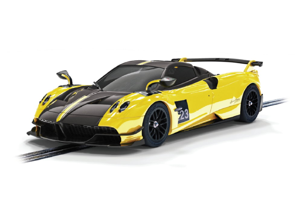 More new tooling… and it’s the Pagani Huayra BC Roadster – a stylish addition to the Scalextric Super Resistant range. The real Huayra is a low-volume Italian hypercar and the BC is a modified track-focused version – twenty were manufactured and sold instantly at £2 million each. Although the Scalextric car is Super Resistant, it looks to have plenty of detail. The Scalextric Huayra model has an inline mounted short-can motor and is Digital Plug Ready. Lights are not fitted in these Super Resistant cars and the windows are blacked-out.