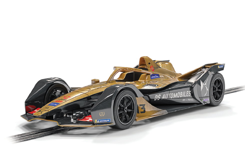 The cars are robust replicas of the 2019-20 Spark Gen2 electric racers that Formula E fans will instantly recognise. The set has a gold DS Techeetah and a blue and black Jaguar. Available separately will be DS Techeetah of 2019-20 champion António Félix da Costa, plus the 2021 Mahindra of Alexander Sims. All four are standard Scalextric analogue cars, fitted with the F1 slim-can motor and magnatraction. They are also Digital Plug Ready (DPR), taking the smaller C8516 F1 Digital Plug.
