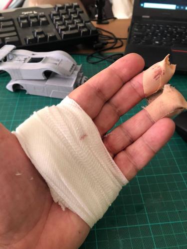 This came from forming the foam core with an ultra sharpe knife. My wife was not amused even when I told her she was the prettiest nurse I know. Three cuts is 24 hours.