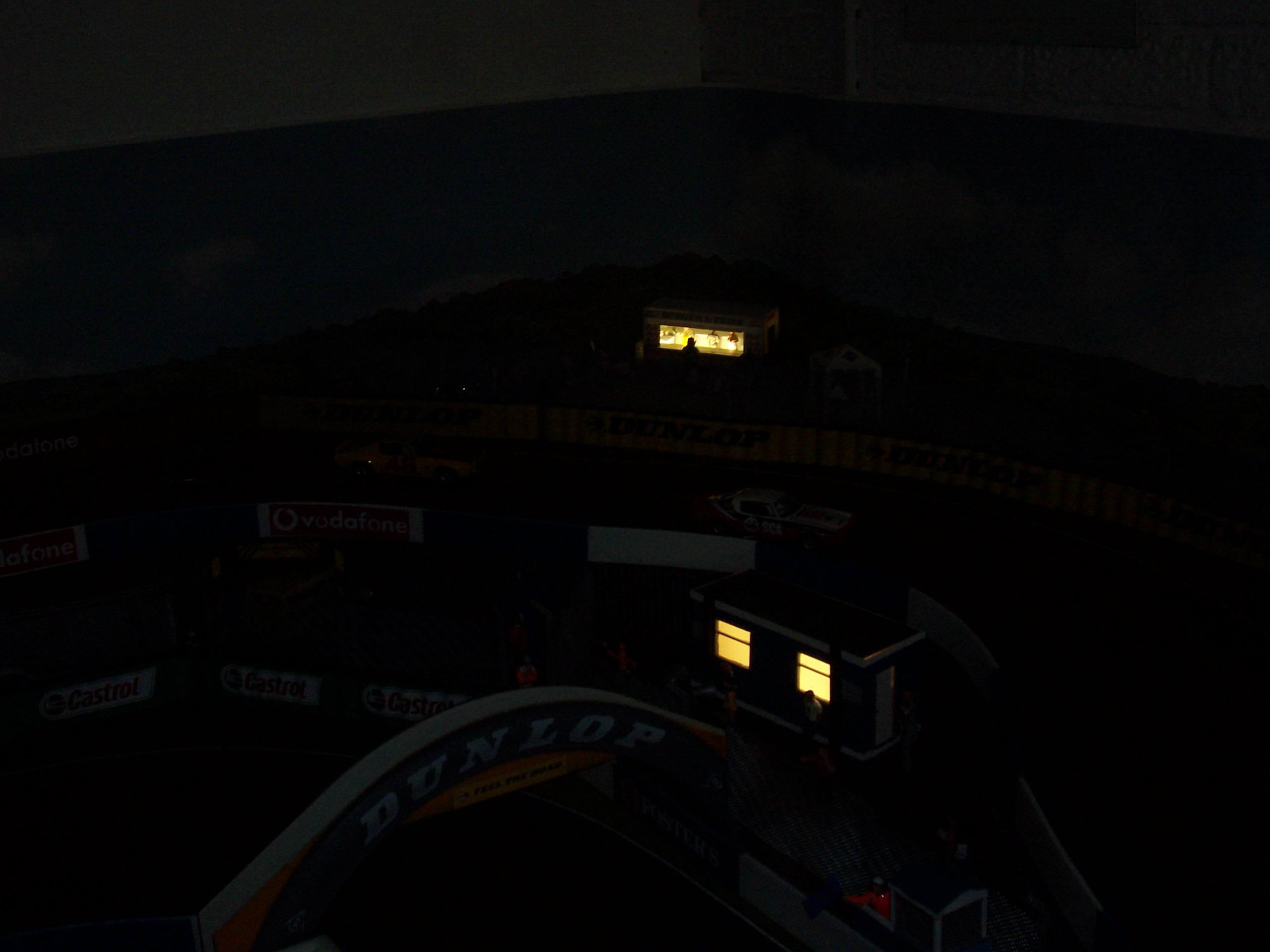 Been putting this one off for some while as it involved crawling about under the track to do the wiring. Anyway, after much cursing and bashing of head on the woodwork, we now have lights fitted in the pit garages.