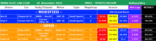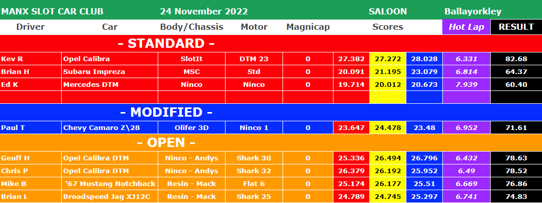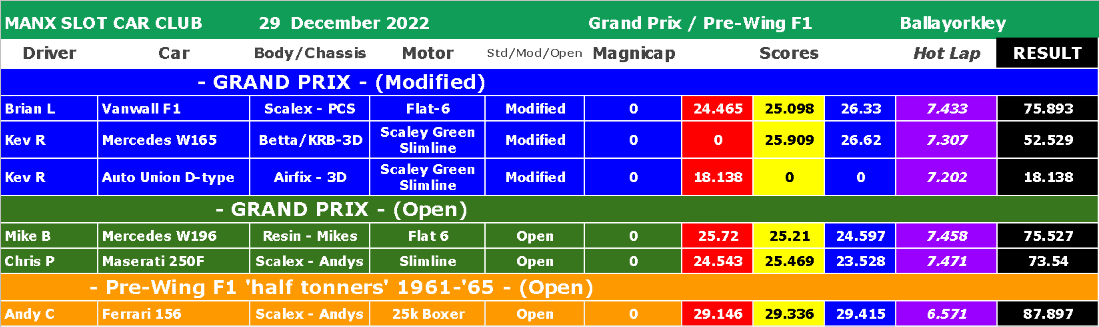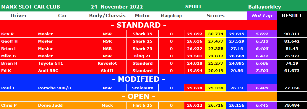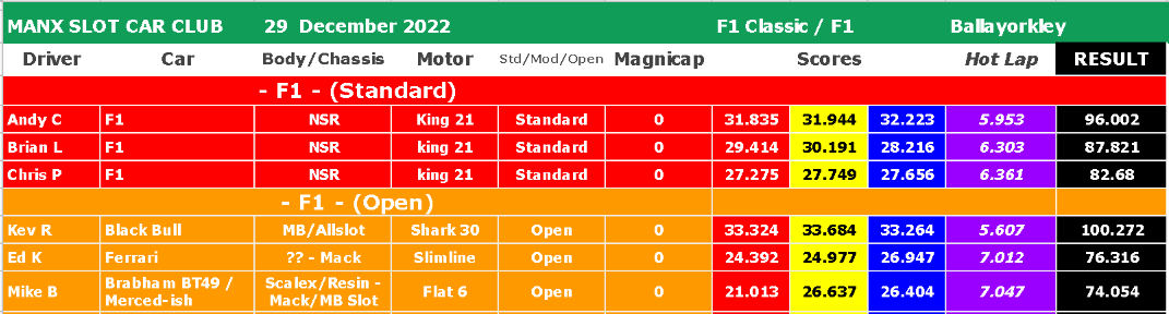 Kev’s was the car to catch tonight, a 29 lapper in Blue was his best lane score. Chris & Brian finished less than a second apart in Heat #2 with the final heat won by Chris a couple of seconds clear of Mike. The other even closer finish for Mike - Heat #4 only inches behind Chris.