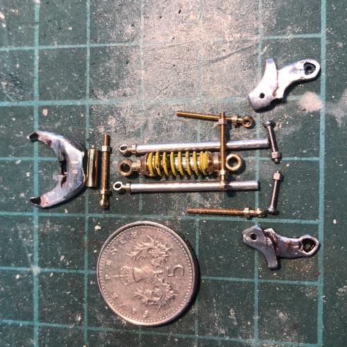 I used these little things which I think are cast anchor's for model boats, I ground the top one and cut in half and ground down the bottom brackets.