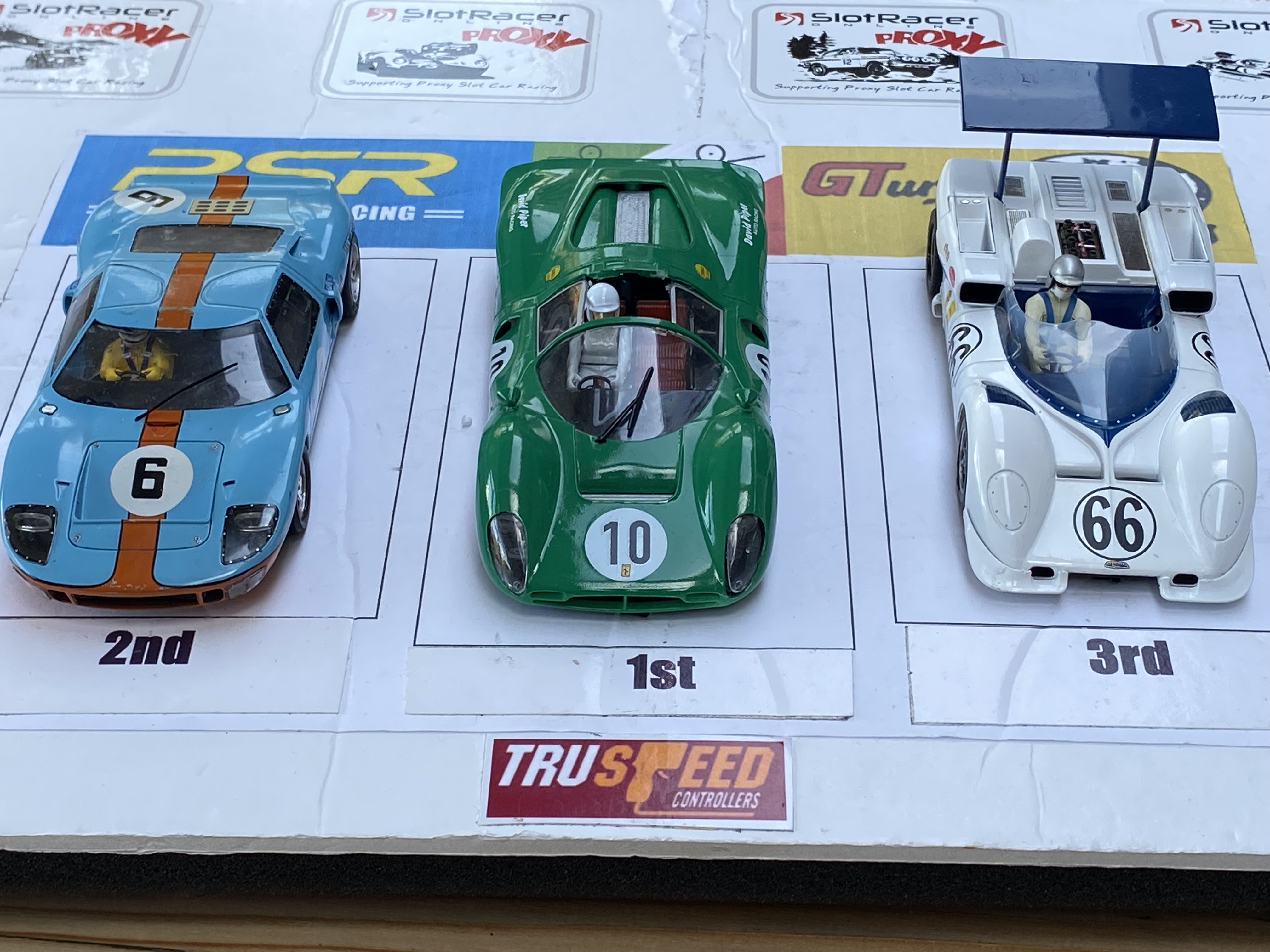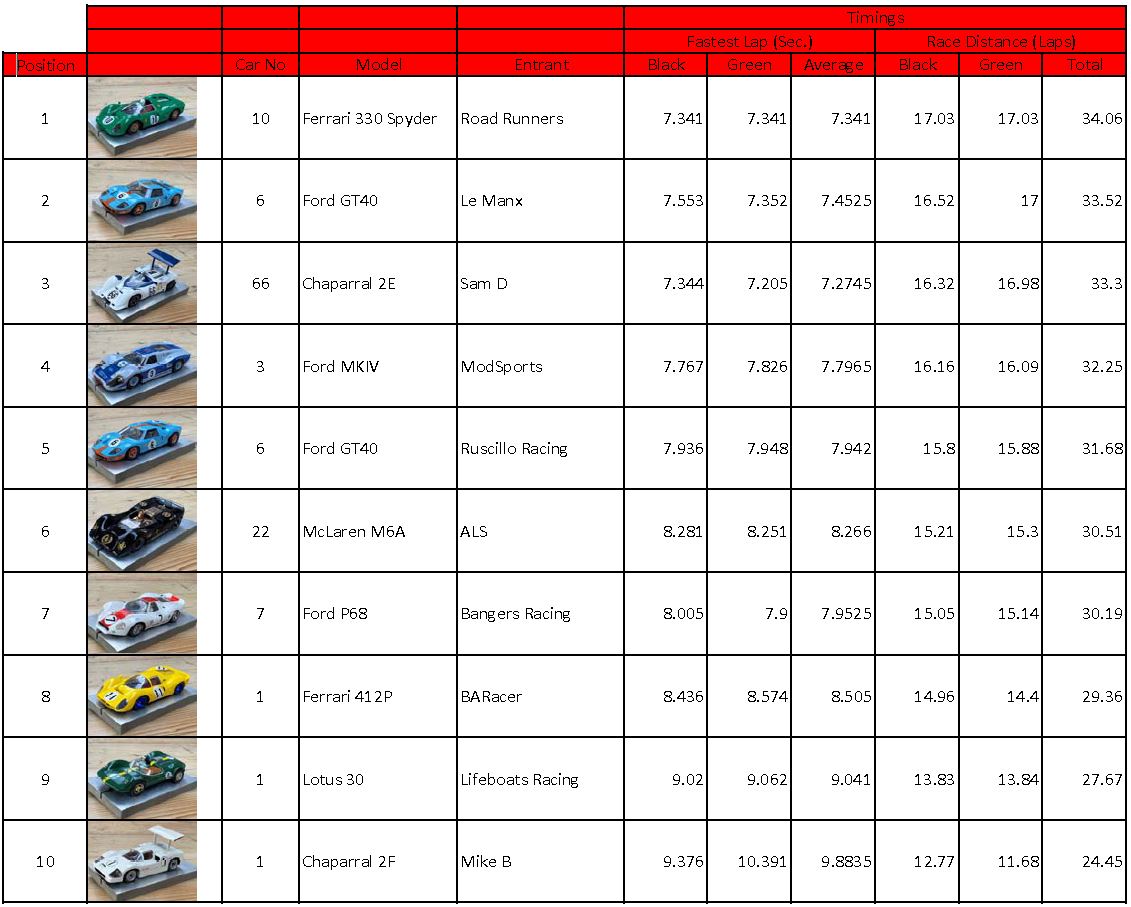 Round 1 of the Goodwood Proxy has been run at Viking SCC. The track is a 6 Lane Policar club track running at 12v with lap timing using Slotmaster software. Both drivers used Truspeed BP2 controllers. The cars were run in green and black lanes (Lanes 2 & 5) allowing sufficient space between them and no significant advantage with corner radius'.