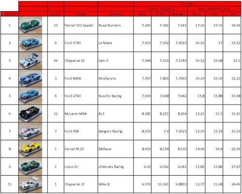 There was absolutely nothing between 2nd and 3rd of Modsports Corvette and Roadrunners Ferrari GTO. Both rounds these cars ran side by side from start to finish; both ending up with the same total race distance. So position was ultimately decided by fastest lap. We used a combined average fastest lap from both lanes which put the Corvette in second over the Ferrari by 0.02 seconds.