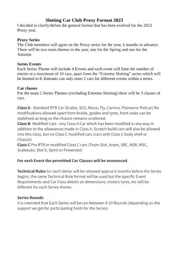I have decided to post a "Slotting Car Proxy Club"  General Format for next year, should help us all understand what we are doing (including myself should I forget)