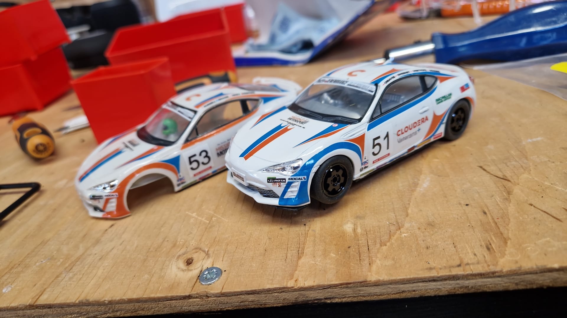 New Staffs Slot Cars 6 spoke wheels arrived and have now been fitted to the two Mission Motorsport GT86 cars: