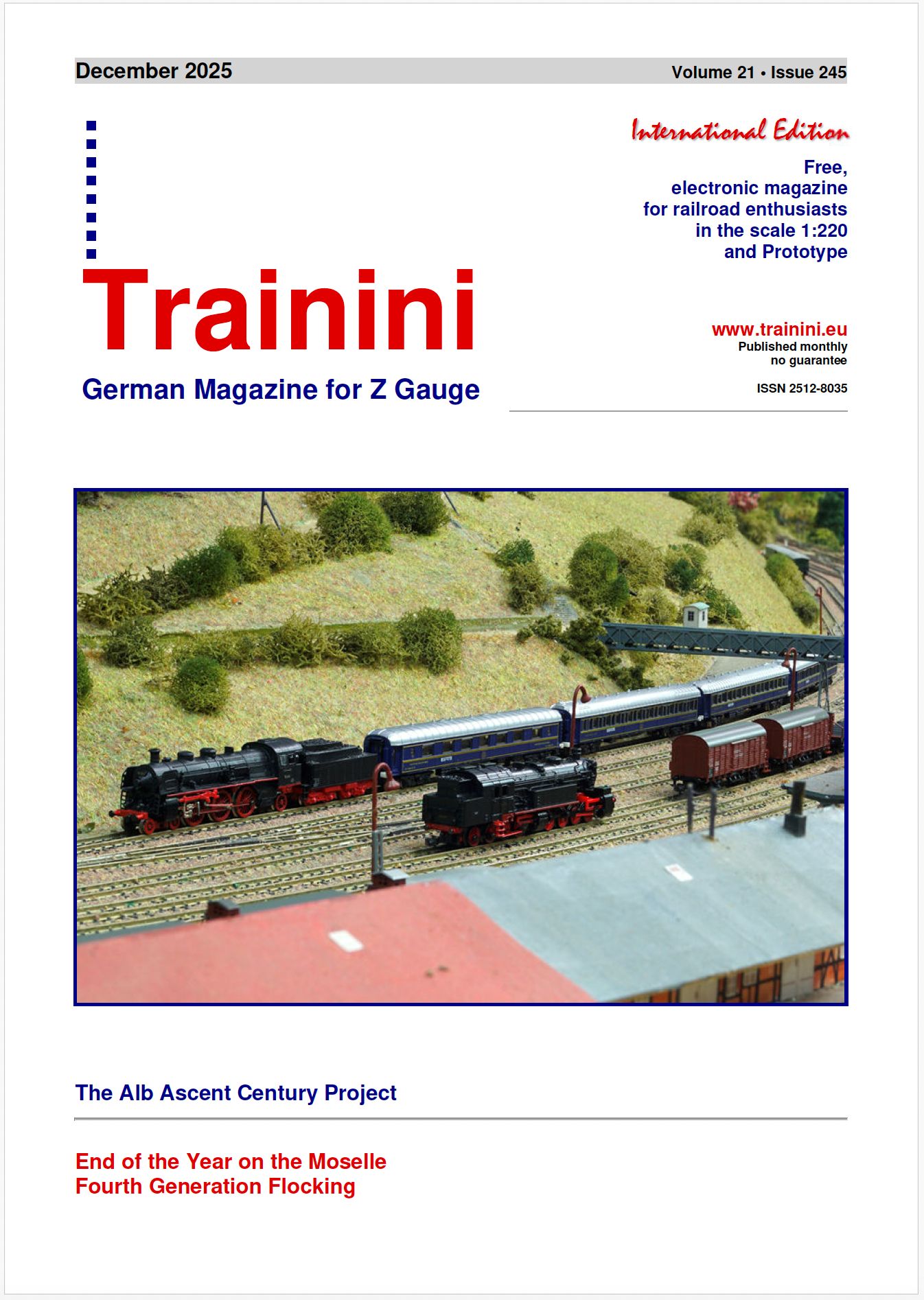 The new free 91 page, issue number 245, December 2025 Trainini magazine for 1:220 scale (Z scale) model trains is available now.