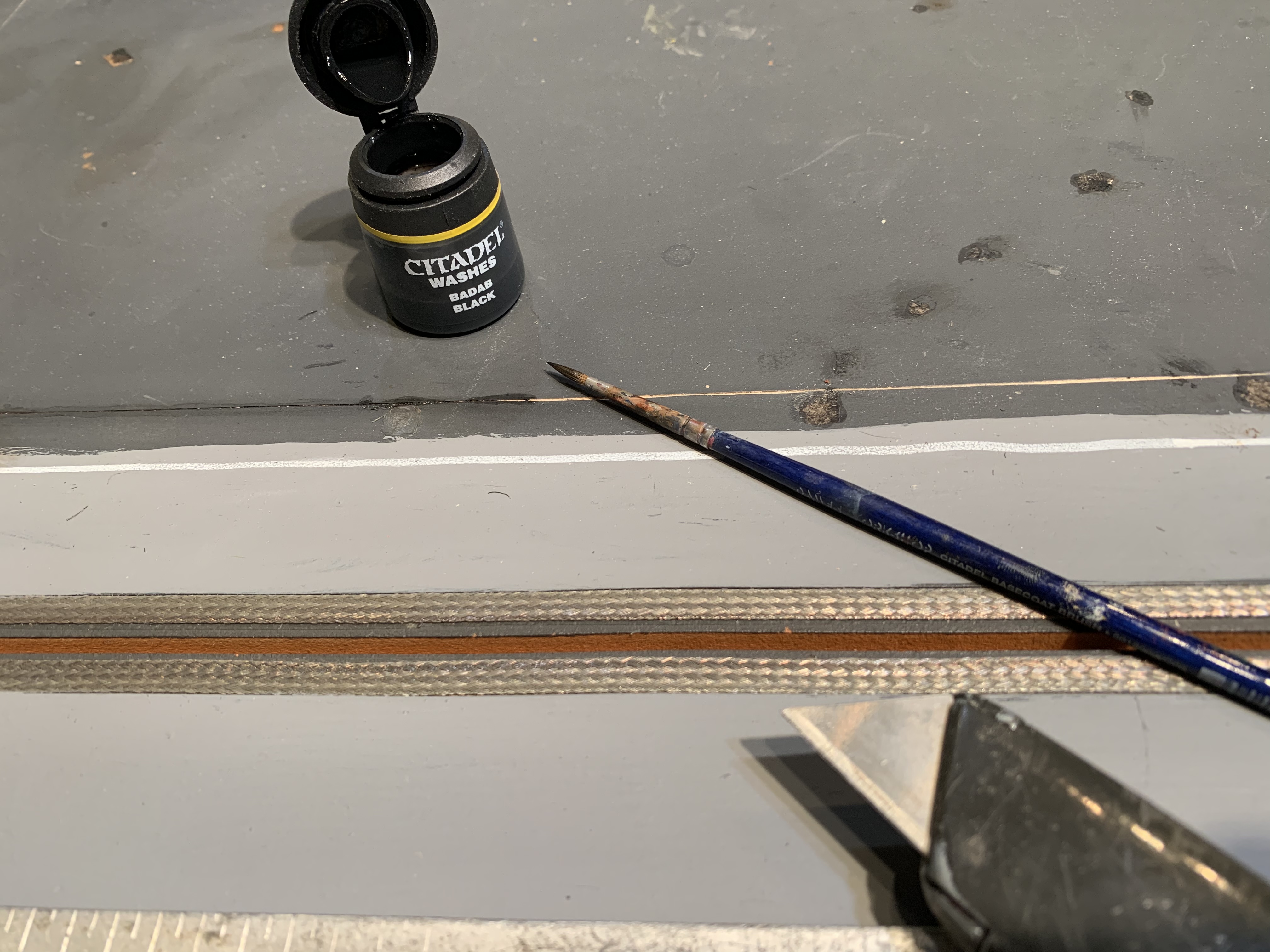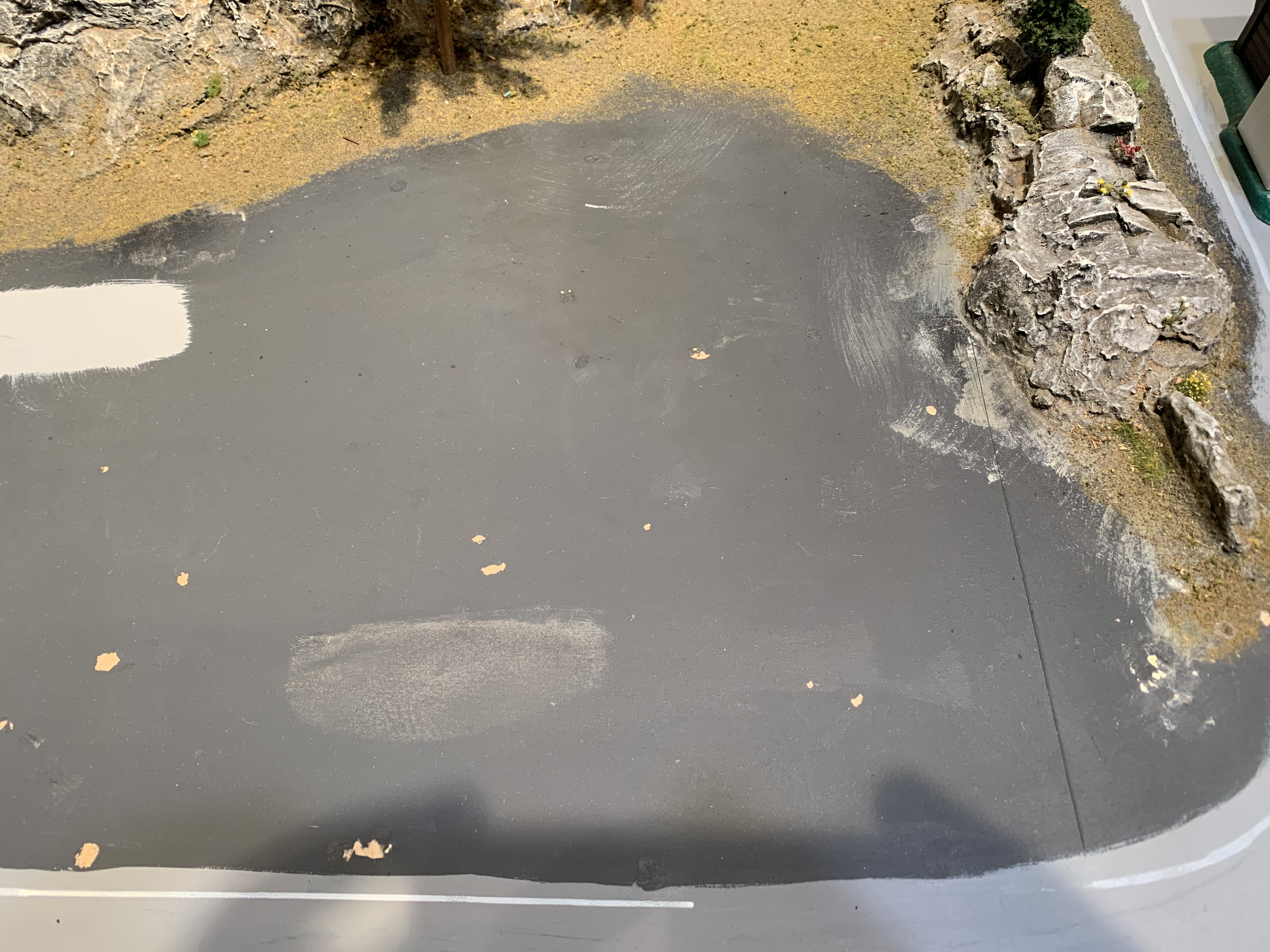 Last weekend I got around to working on the ground in the pit area. Was always meant to be poured dark concrete with the appropriate groves etc. Here is how I did it.