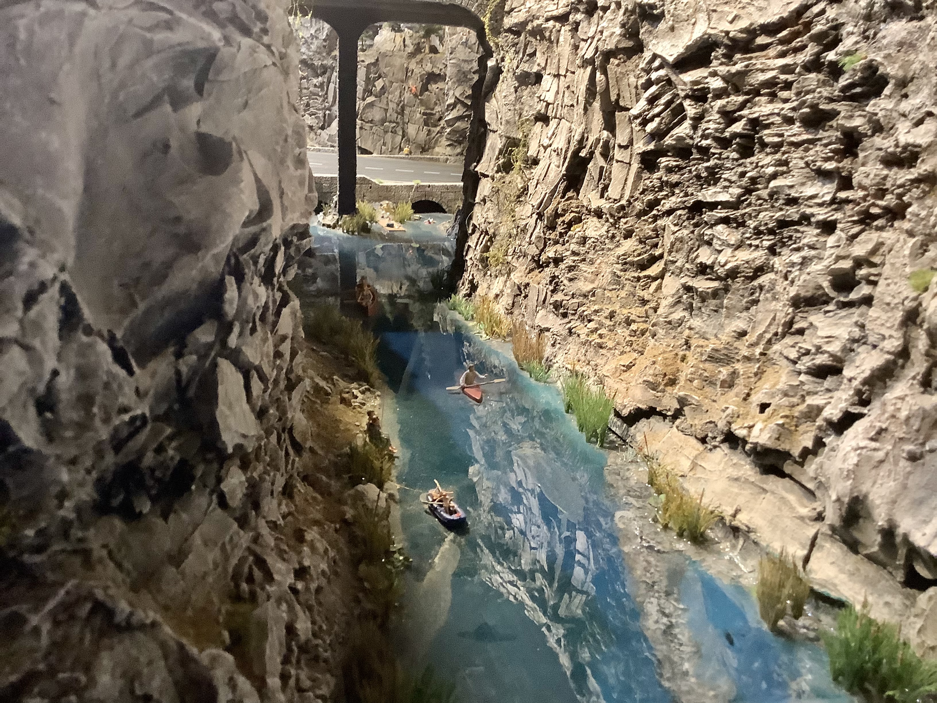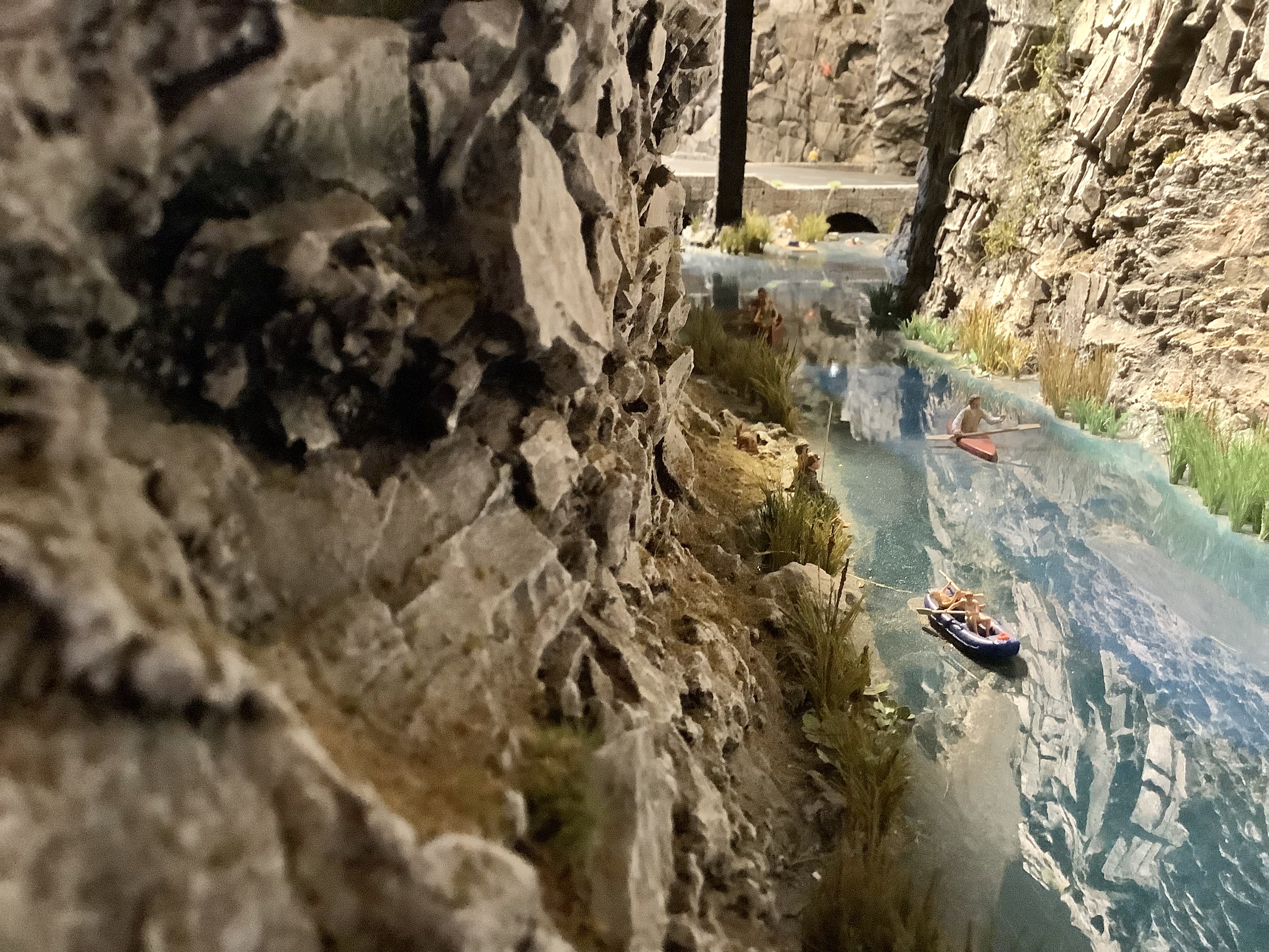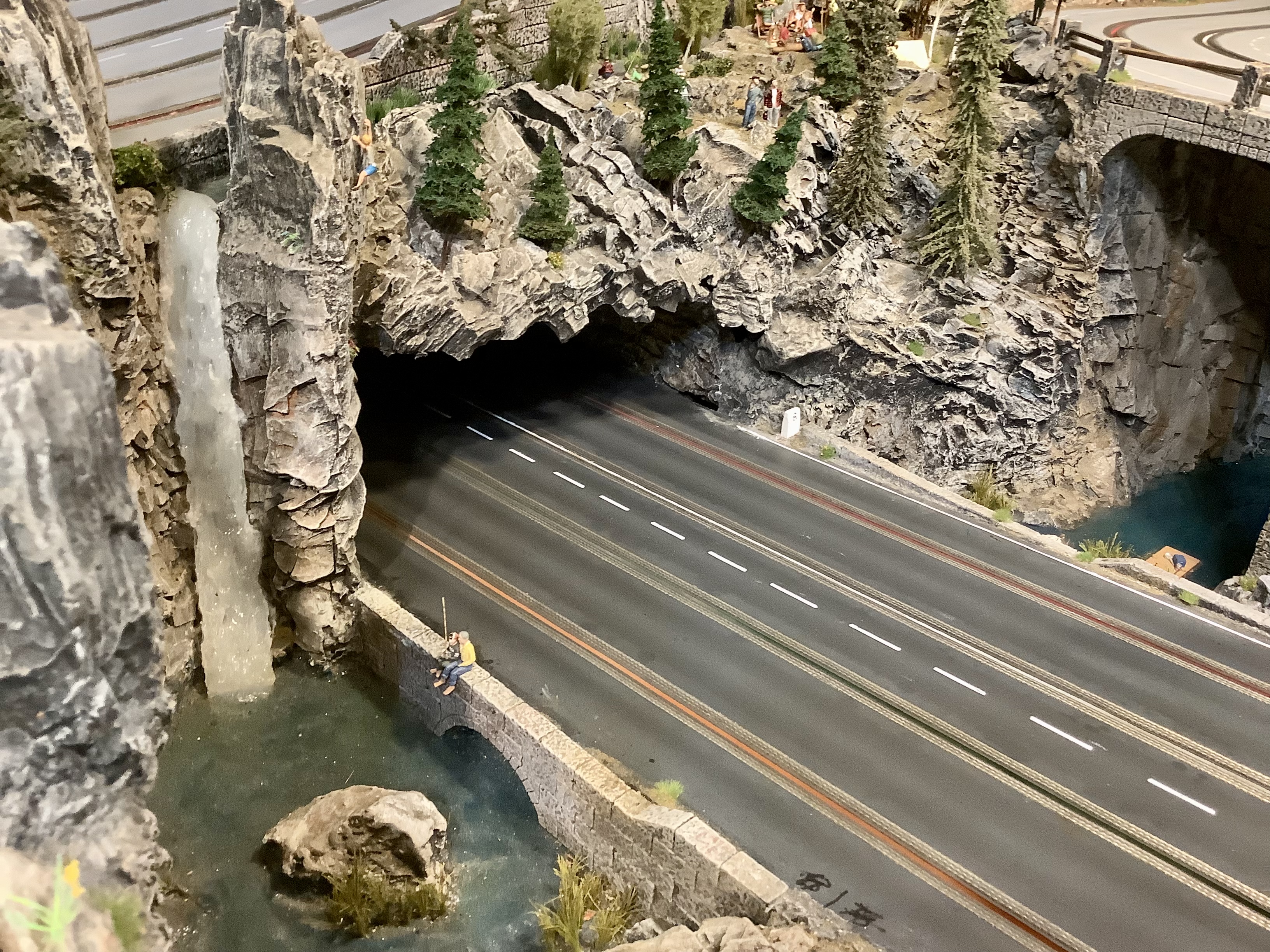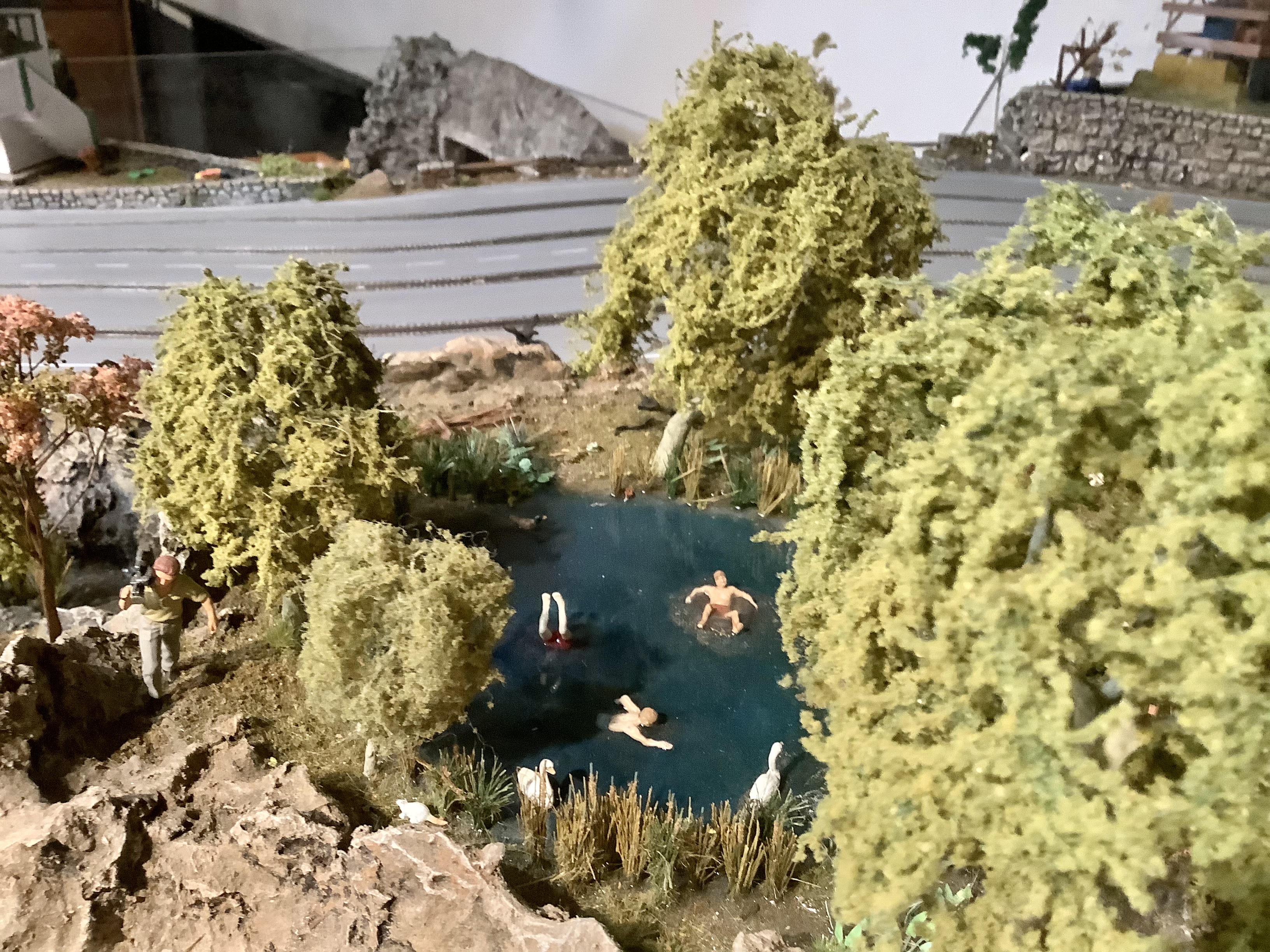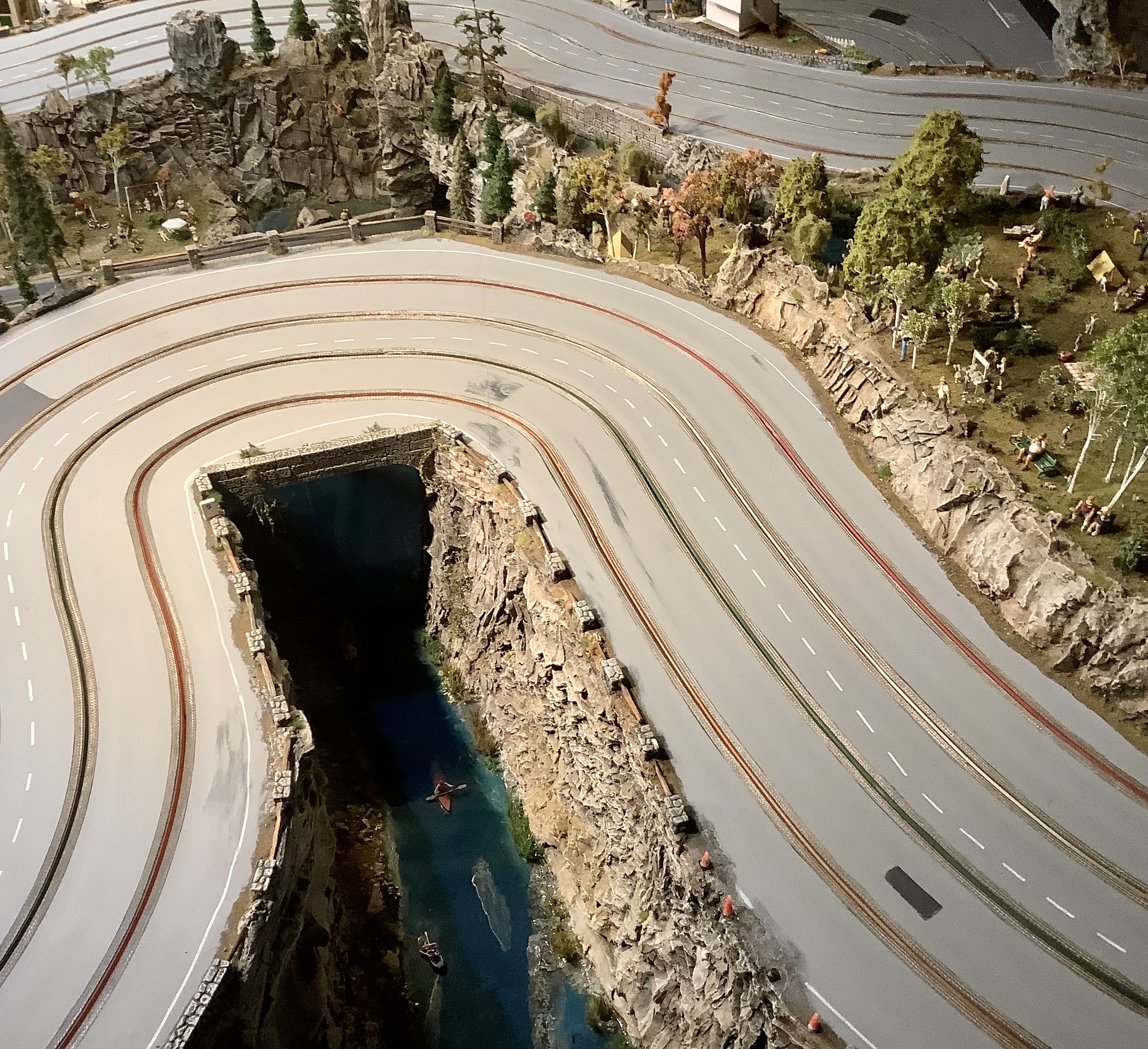 Took some updated pictures of the water features on the track. Simple Resin and ModPodge over painted wood and a Little Rock features. I did water in infield but I used it as a story. The pond at the top is a spring, that some beavers made a dam on, which created a little waterfall, which made a stream along the top of the track, which lead to a big waterfall into the pool pond, which empties out under the road through a culvert into the gorge, and that gorge is why I needed a reason for the water to come from somewhere! I might be obsessive.