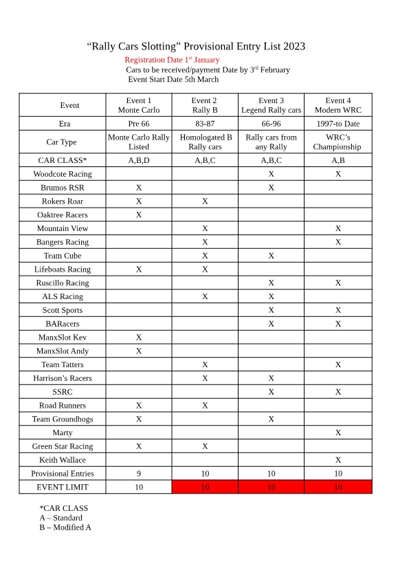 Inevitably as entrants grapple with looking at building their preferred models to the rules, there will be problems and I will get requests to change cars in an Event or across Events. My intention is of course to have a balanced field across all 4 events, and I would ask that if possible that entrants at least keep within the Events which they have indicated they wish to run in. But bearing in mind that this is not a points based Championship Proxy, up until the Registration date 1st January some changes can be tolerated. After the Registration Date on the 1st January such requests will be denied.