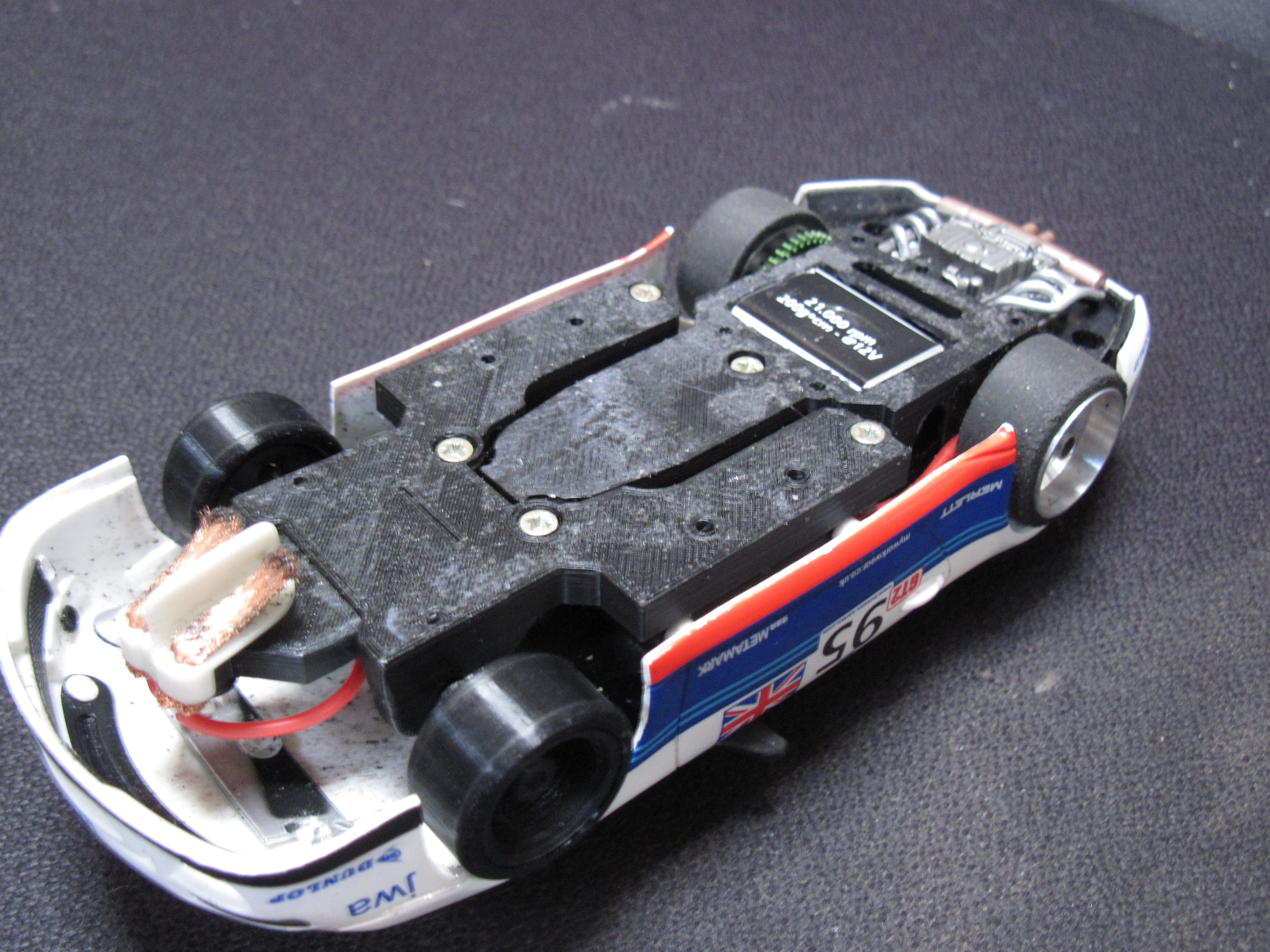 Two versions available either SW for short can boxer (Revoslot 21K fitted or the original Xlot motors) or IL for the Flat 6 motor. (Note Flat 6 version, the interior requires surgery, SW does not.) Both chassis' have a floating pod either on a Torsion arm or springs (IL) or torsion arm only (SW). Pod takes the 3mm axle flanged ball races, and requires either Slot It SW cog (drilled out to 3mm) or the BRM 1/24 cogs for the IL version. Both chassis' use the original Ninco side body mounts which can be adjusted to centralise the chassis in the wheel arches.
