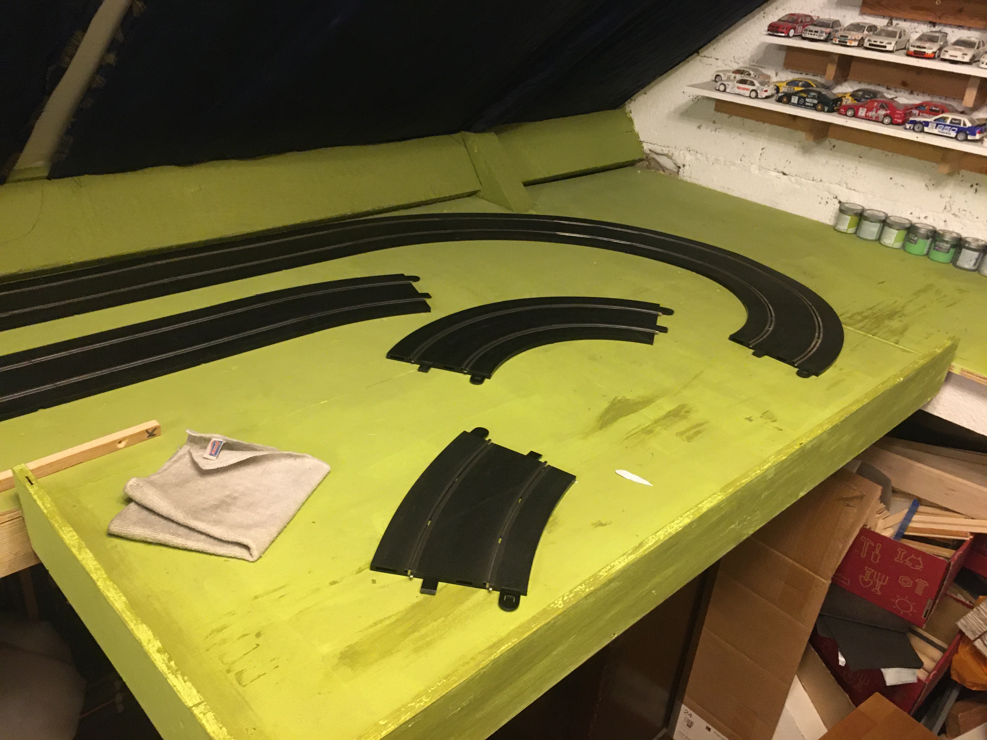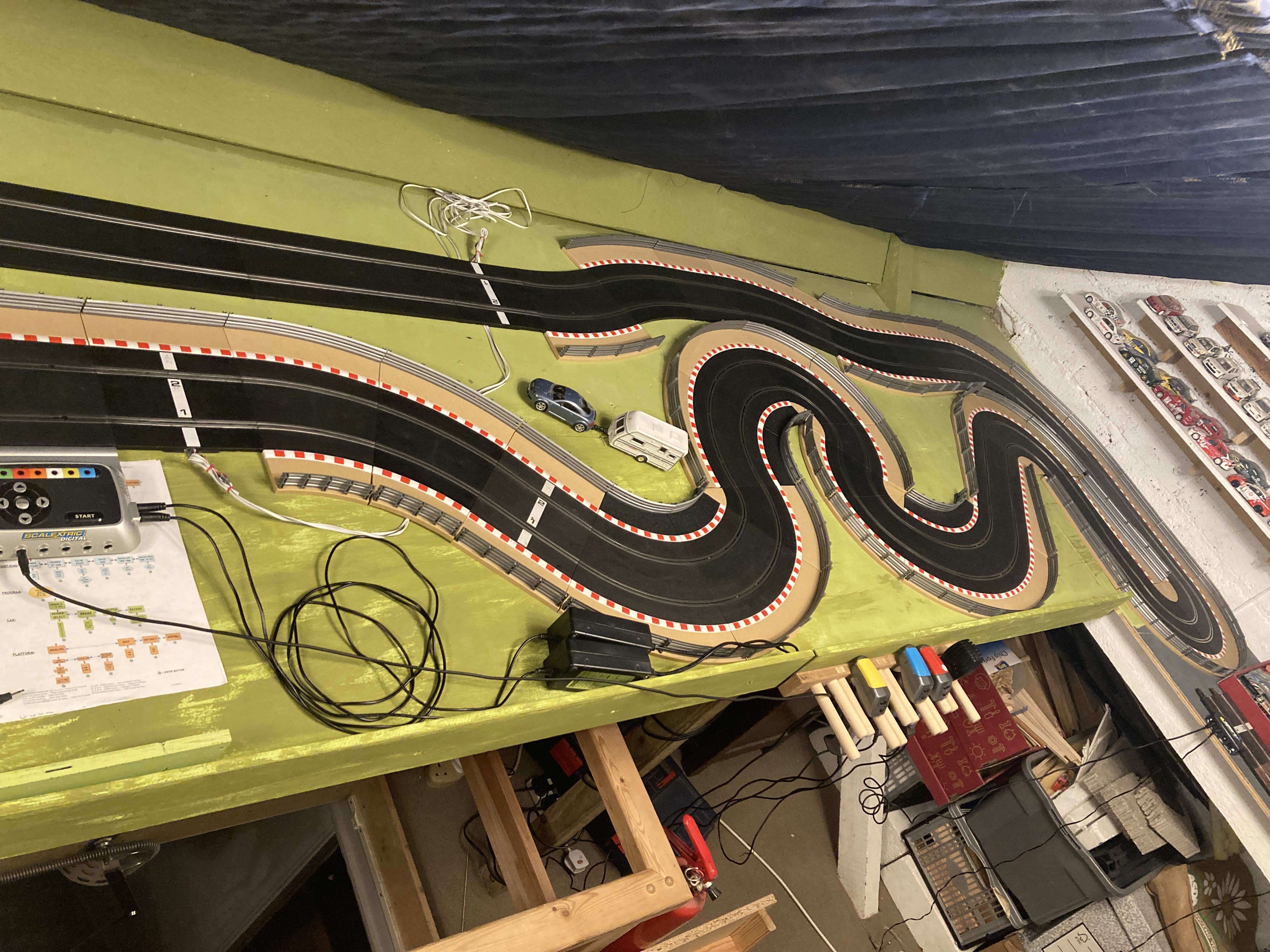 Before I tried to find all the bits to make these tracks I built up a simple track with whatever pieces came to hand from the boxes on the top of the pile, just to have something up for a bit of fun. I’m using one end of the track surface that goes around the loft hatch, so it’s a smaller track, at least for the time being. After not using the APB for the best part of a year, I couldn’t even get it to start up in the right mode or change it from digital to analogue without having to dig through several boxes of slot stuff to find the manual and have to read it through. Again, another element of digital slot racing that’s a big turn off. My PS4 doesn’t need a forum-user generated manual before I can work out how to get it to play games. Slot car system manufacturers have a lot to learn about accessibility and user interaction. Oops, moaning again!
