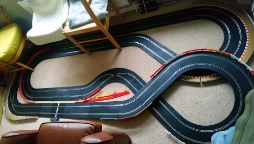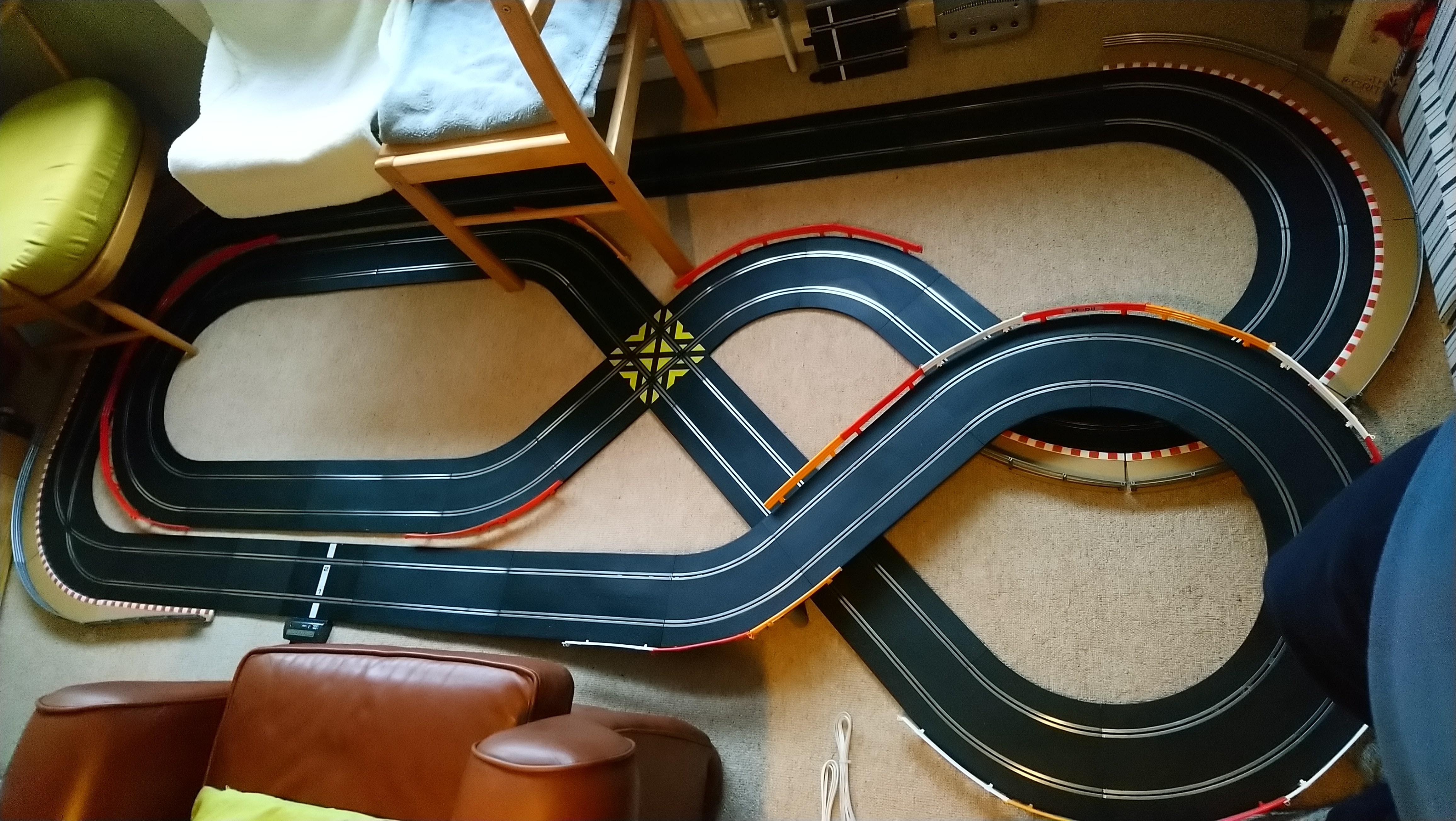 I've added a third crossover so a car goes round both lanes continuously, and there is a lap counter hidden under the chair. So the intention is to set a timer for, say, 5 minutes, and see how many laps I can do in that time. Fettle the car and repeat, fettle and repeat etc until I find the sweet spot.