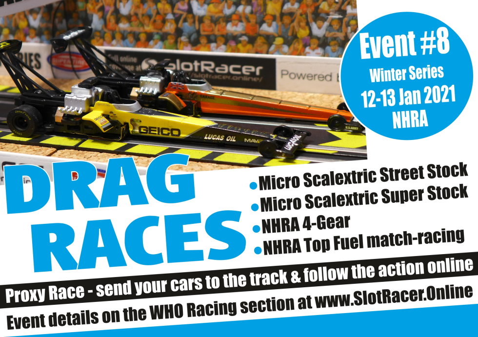 The third of our five-date Winter Series is coming up fast! This one is NHRA-themed - featuring Micro Scalextric Street Stock, Micro Scalextric Super Stock 6.0, NHRA 4-Gear Funny Car & Pro Stock - and some NHRA Auto World Top Fuel match-racing. Qualifying is on Tuesday 12 January, racing on Wednesday 13 January and all the coverage is right here on SlotRacer Online.