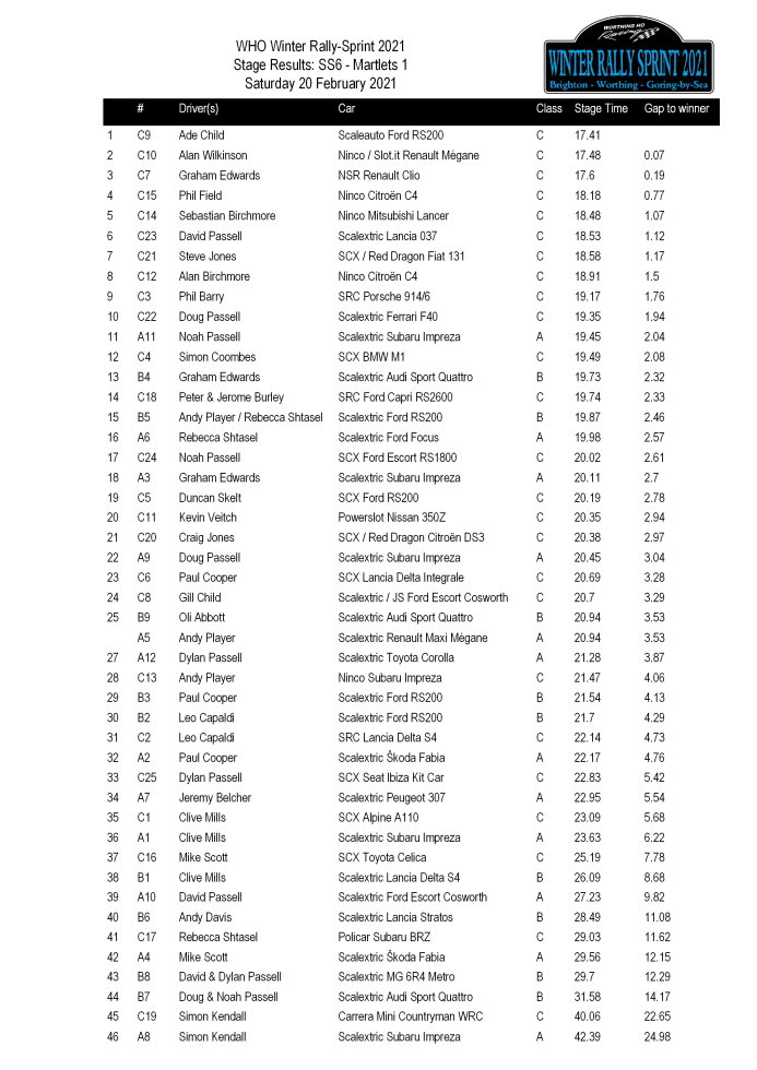 Class A - the Scalextric WRC cars - the standings look like this...