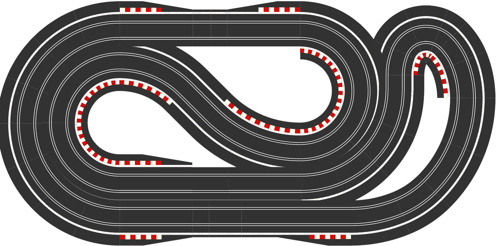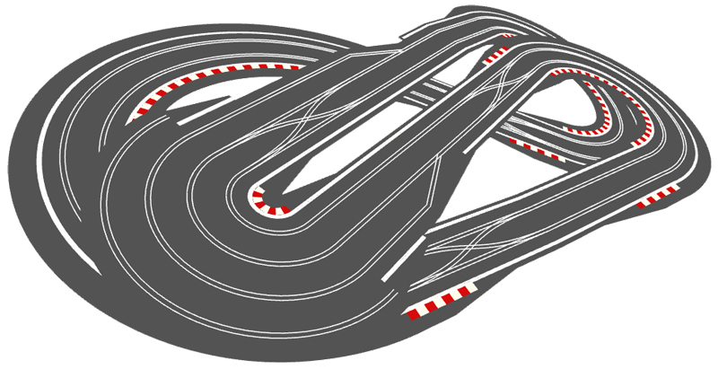 But looking at the tracks above, I just wonder whether something like SCX-5015 or SCX-5112 might make a better test track? They might not be as visually appealing, but they have a much more even balance of corners. You could replace the flat R3s on the left with banked R3s, which would give you a nice high speed section round the outside, and you could replace a couple of the R2s with an R2 crossover curve, so that you drive both lanes, and therefore test your cars on every radius of corner that Scalextric have to offer. Just a thought.