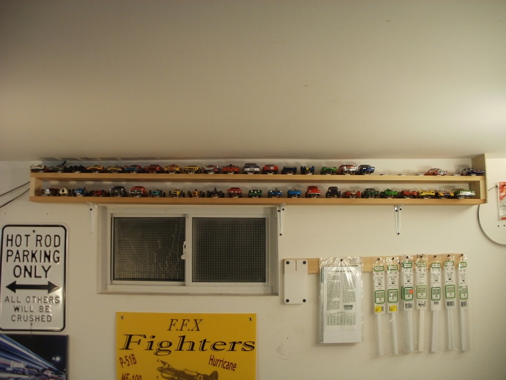 I have very little space for totes or storage boxes. Two pine shelves were installed on the wall near the ceiling in my work shop (7-foot ceiling). The cars sit on white plastic pads to keep the tires off the shelf. It works for me.