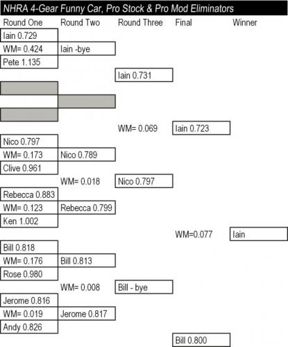 A minor upset... Eighth place qualifier Jane beat fifth place Bill by the slimmest of margins - 0.009 seconds. Both cars were a little on the slow side with ETs of 0.546 and 0.535.