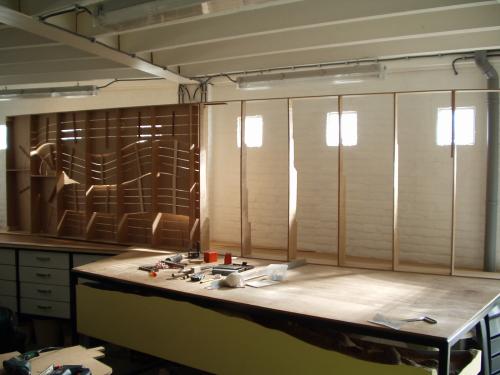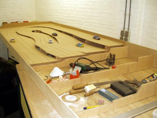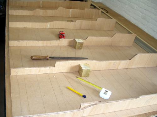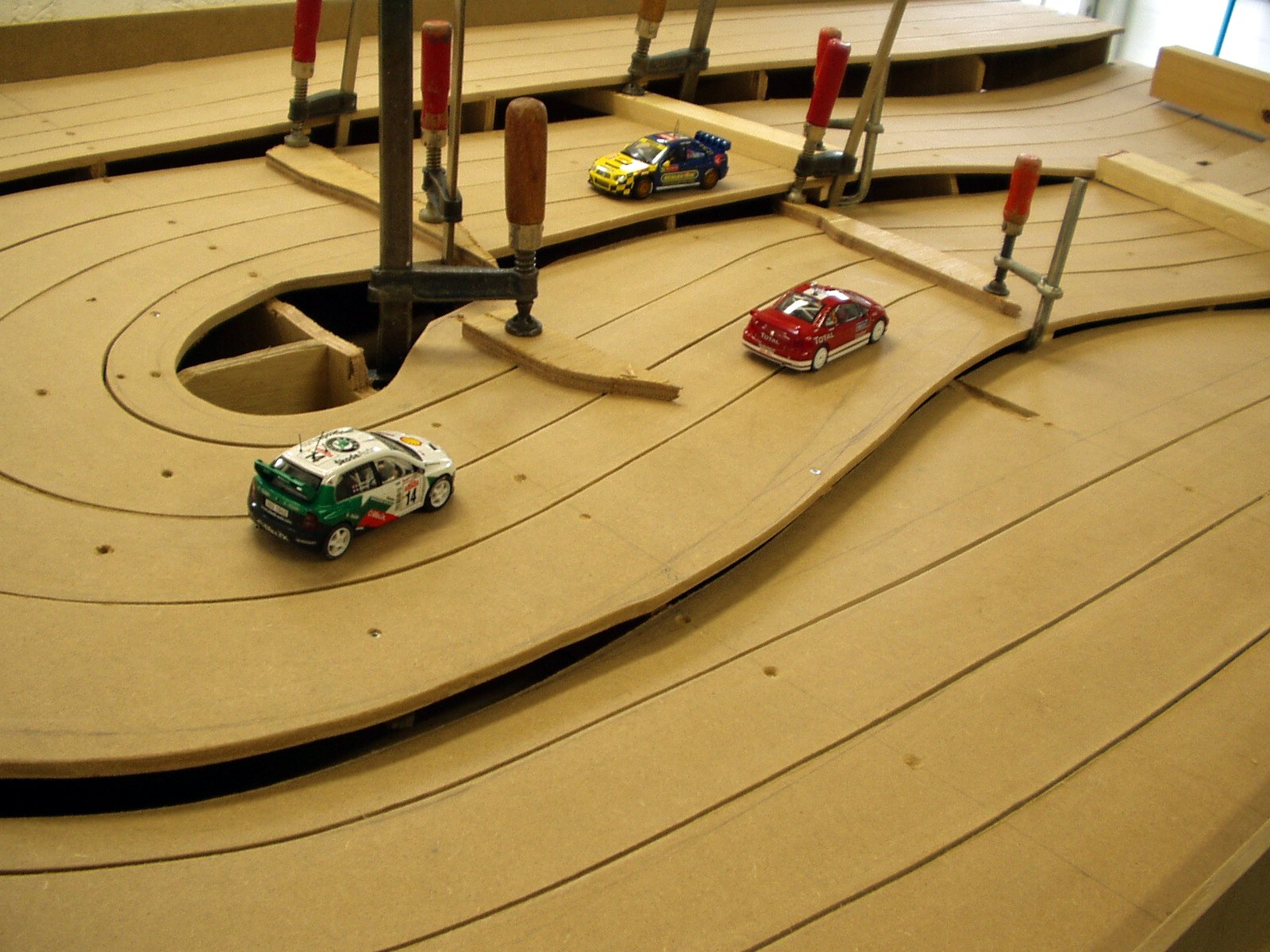 Drawing the track on two 8mm mdf plates 2.44mx1.22m. 2x6 times 10mm vertical multiplex base strips inside the outer frame.