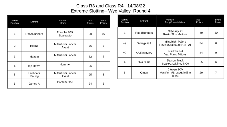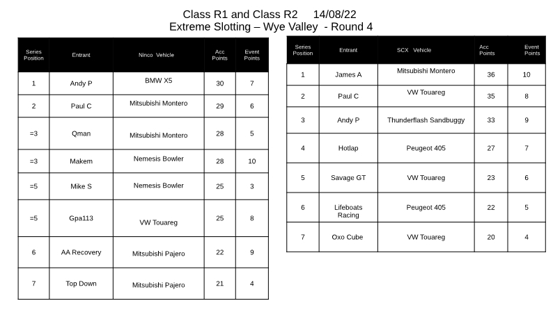 you guessed it, RoadRunners Odyssey "running away" again with 1st place, not far behind was the AA REvovery Van, and 3rd the Pajero of Savage GT which seemed to suffer a little on this one. Again a poor day for the Datsun of Oxo Cube and the Citroen 2CV of Qman with more "offs" than could be easily counted.