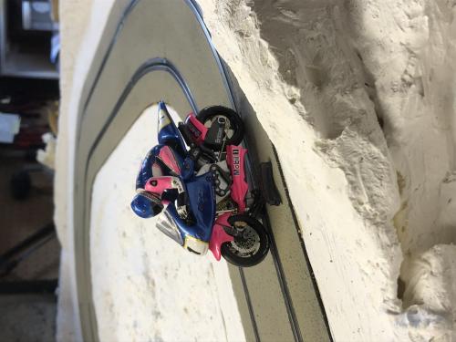 I have spent the last few evenings tweaking heights of elevation to see if cars and my bikes can handle the track, this bit has been enjoyable.