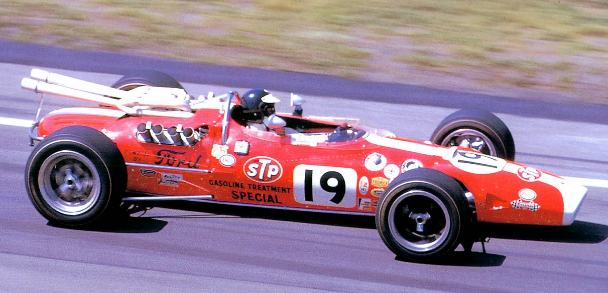 The Lotus 38 was designed by Colin Chapman and len Terry as Lotus' 1965 entry for the Indianapolis 500. It was an evolution of the previous Lotus 29 and lotus 34 Indy designs, but this time with a full monocoque tub chassis; it was powered by the same four-cam Fod V8 fuel injected engine as used in the 34, giving out around 500 bhp. In all of them, the engine was mid-mounted, improving the weight distribution and giving it good handling. The 38 was significantly larger than any F1 cars of the time, but was dwarfed by the massive American front engined roadsters.
