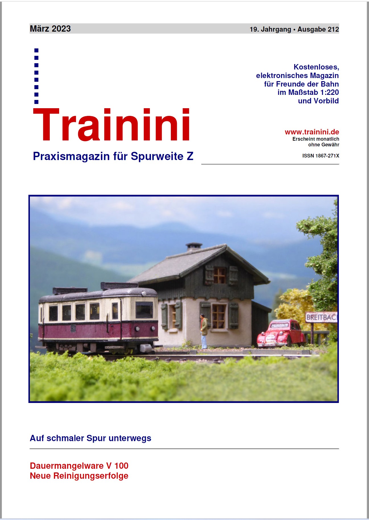 The new free 46 page, issue number 212, March 2023 Trainini magazine for 1:220 scale (Z scale) model trains is available now.