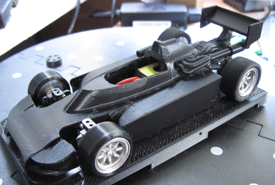 Body, wing, trumpets, chassis, pod, suspension plates & guide 3d printed the driver is a resin cast by a mate. Pod has a 1mm offset axle held in Slot It spherical bearings and rear wheel & tyres borrowed off an NSR F1.