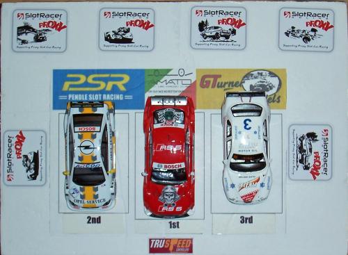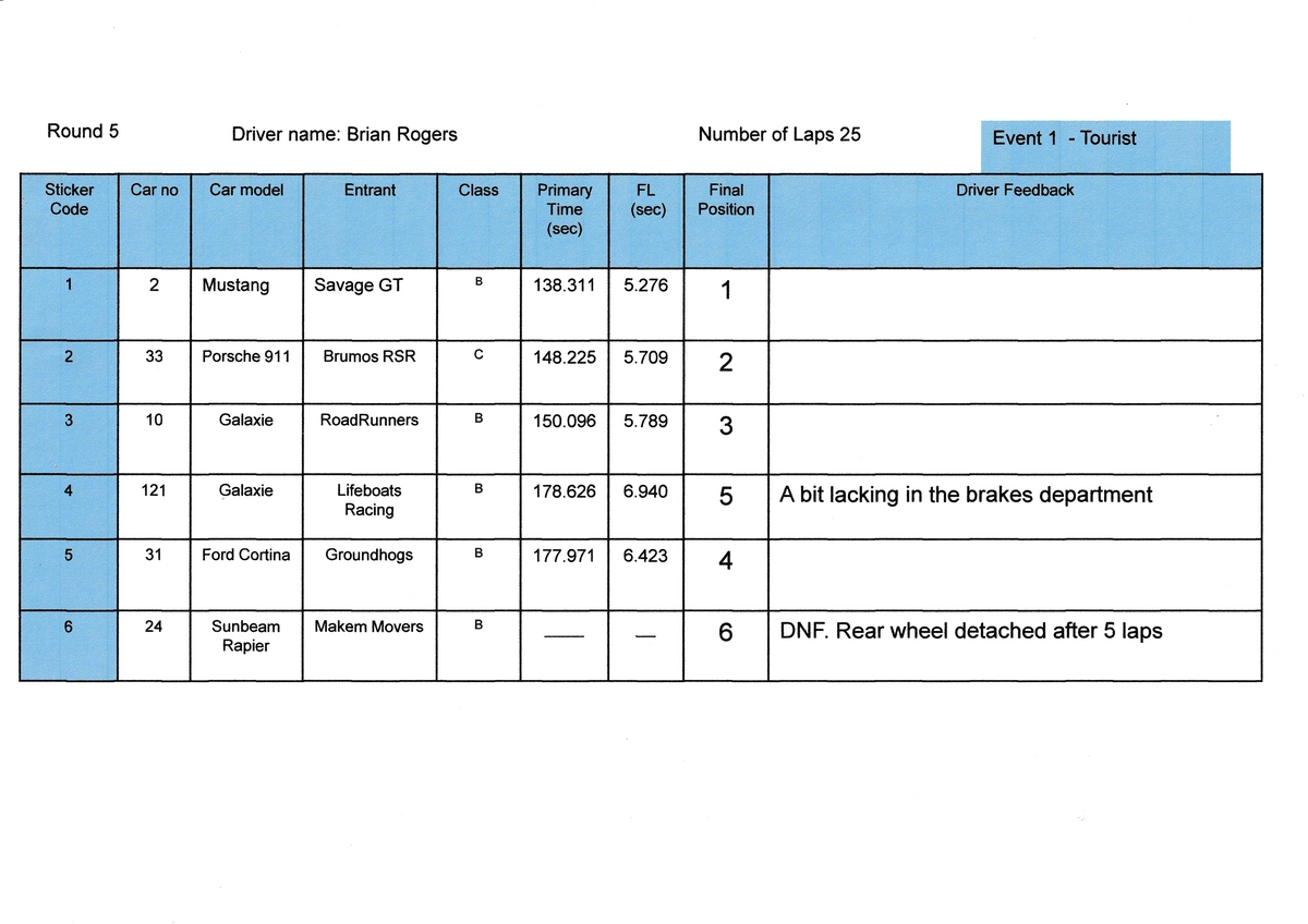 A bit of a shake up to the established order with Deadhead's Rover the class of the field and Green Star's Escort tumbling down the order to eighth. Bangers' BMW was just pipped into 2nd place by .5 of a second over the 25 laps and Makem's Camaro made a significant leap into 3rd place.