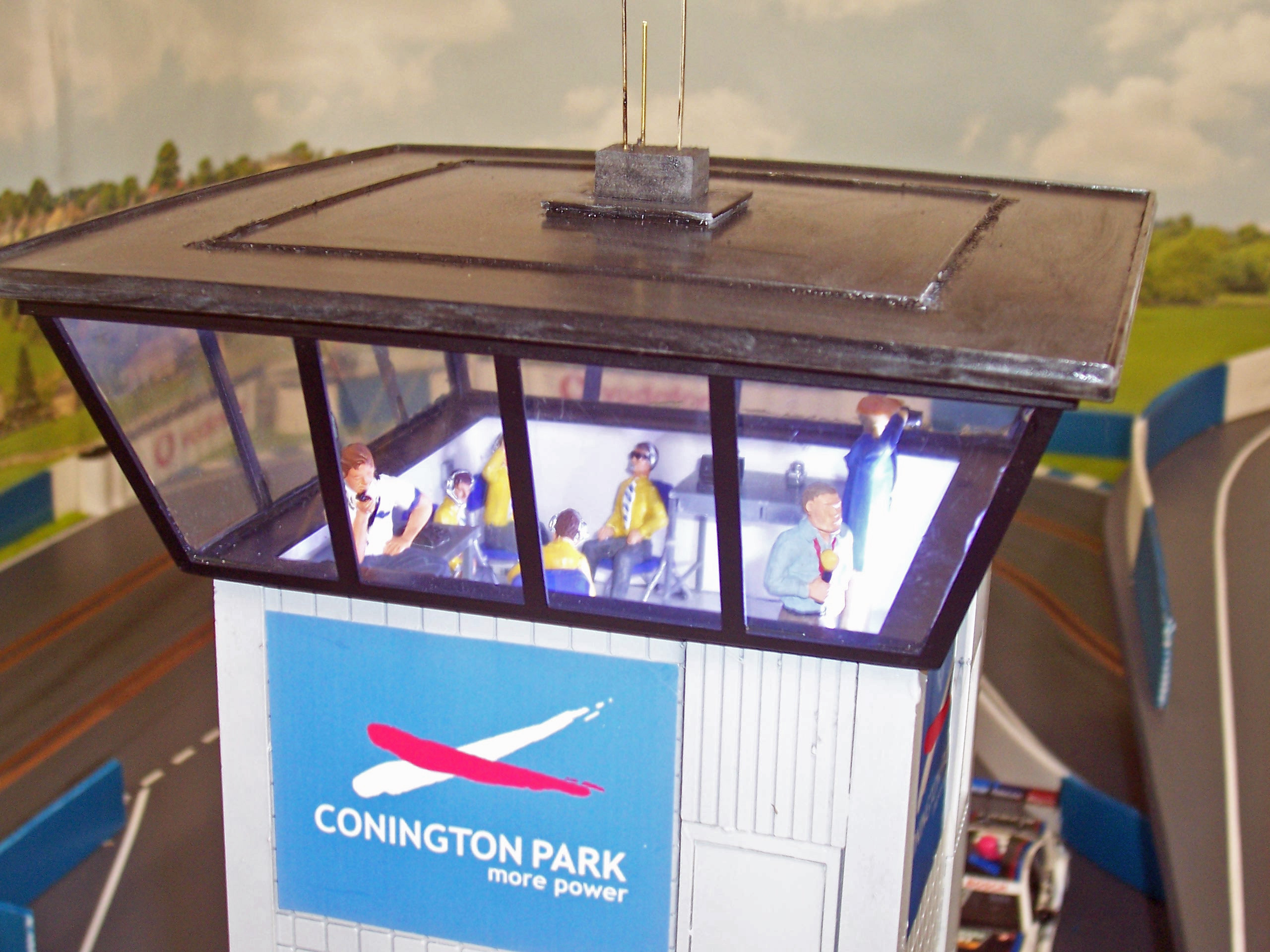 Finally finished off the control tower - timing officials plus furniture bits and pieces added, lighting wired up:
