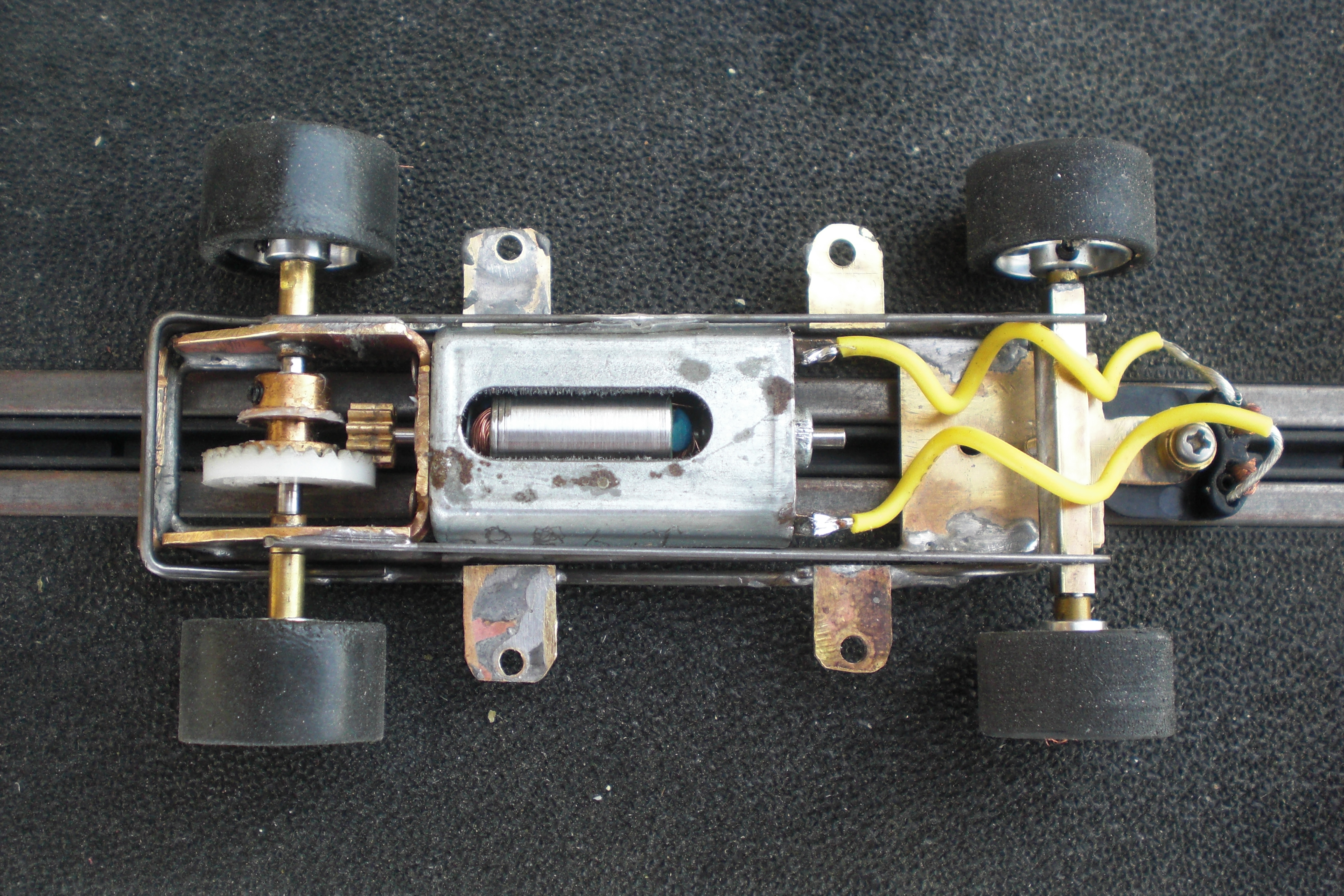 Hello Anthony, the Mini is a Scalextric,.........a repaint with a scratchbuilt brass/wire chassis, built for a club member,......sorry, but I do not have any chassis pics.