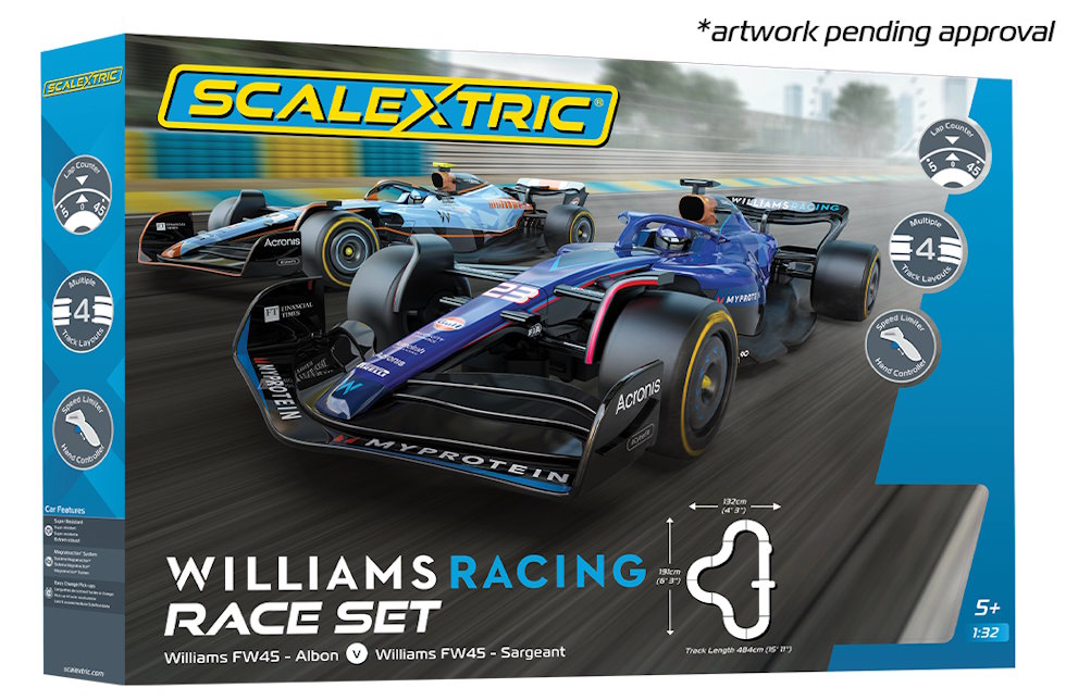 The first is the Williams Racing race set, a welcome return to a proper fully-licensed current Formula One Scalextric set. This includes the 2023 Williams FW45 cars of Alex Albon (standard livery) and Logan Sargeant (Gulf livery) and a basic track layout. It is competitively priced with an RRP of £139.99 and is expected in the autumn. The two liveries are exclusive to this set.
