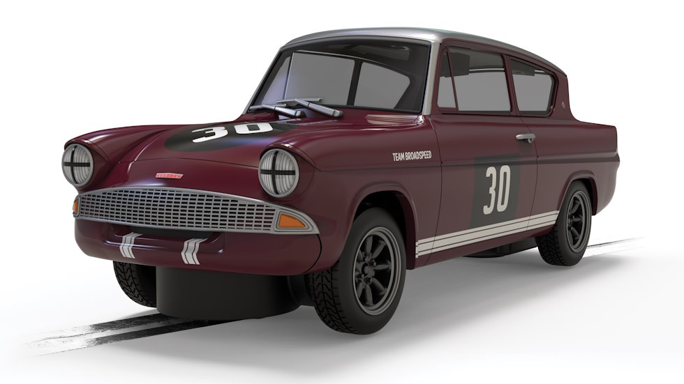 After much nagging, Scalextric have given us a Ford Anglia 105E. The first release is a Broadspeed-prepared and liveried racer as raced to victory in the 1966 British Saloon Car Championship by John Fitzpatrick. The Anglia was Ralph Broad’s first Ford - he kept the body, engine block and gearbox casing pretty much unaltered from the road car and then worked his magic. The heart of the Anglia’s BSCC success was the 997cc Cosworth Formula 3 engine that revved to 10,000 rpm and delivered just under 120 bhp. Fitzpatrick was dominant in the under-1000cc Class A and pipped John Rhodes Class B Mini to the championship on a countback of class wins.